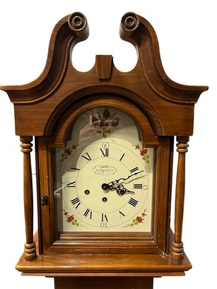 Beautiful traditional grandfather clock featuring a high-quality German Urgos mechanical movement and classic Colonial-style wooden case.