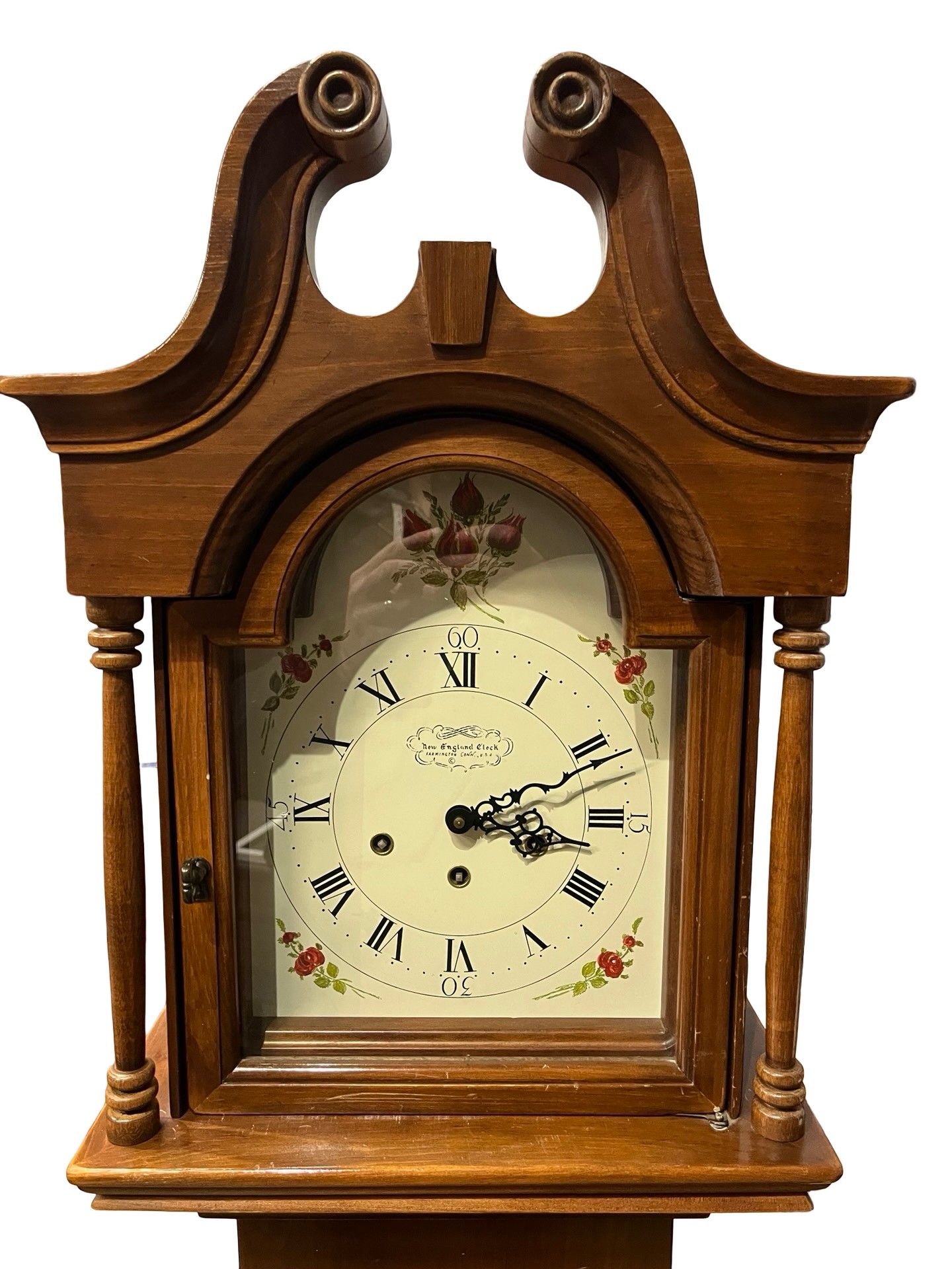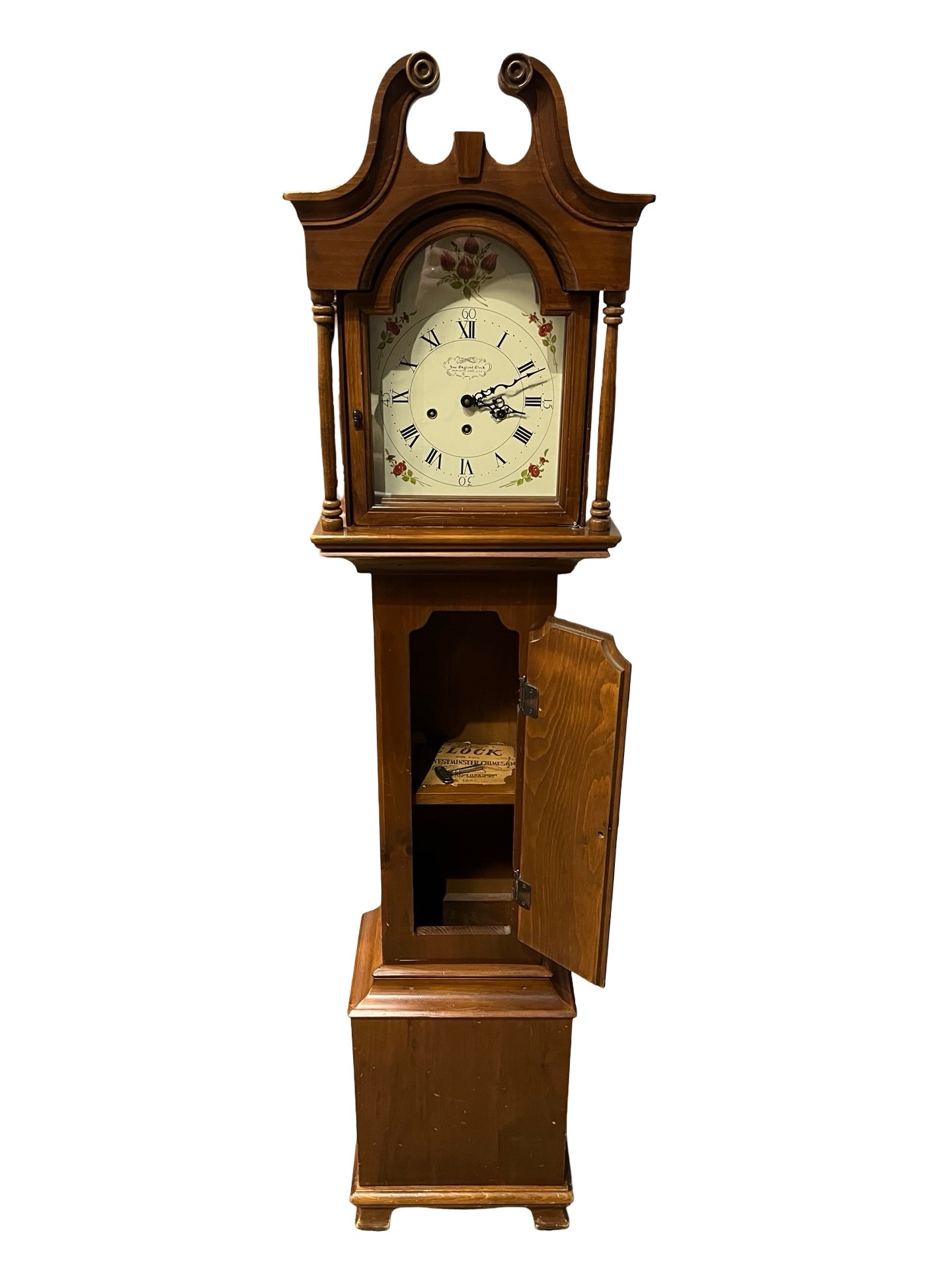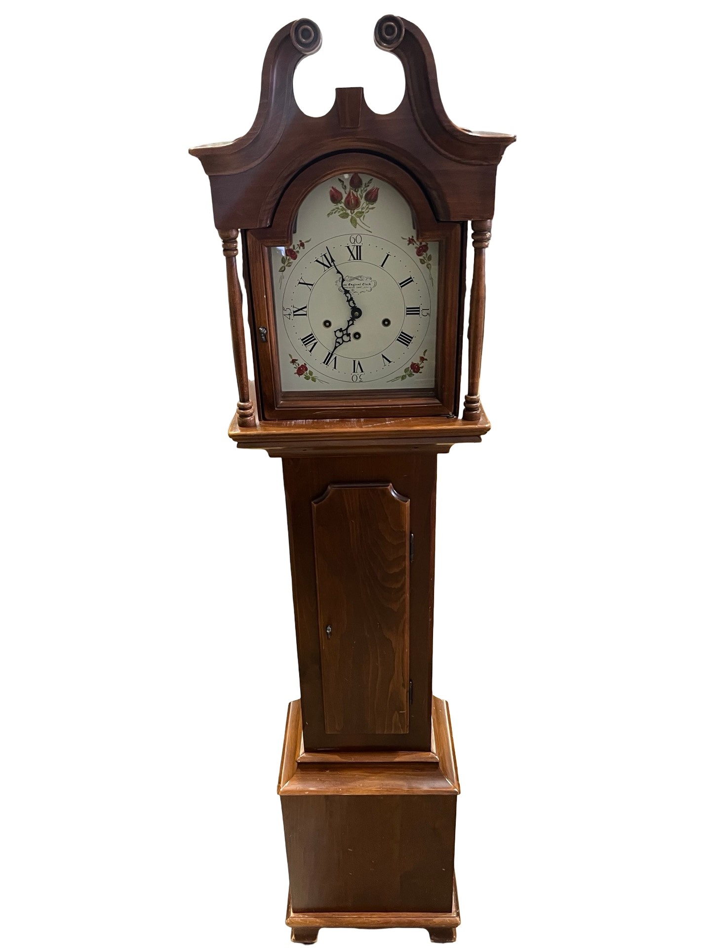 This is a full-size floor clock with arched bonnet top, painted Roman numeral dial with floral accents, and triple-chime movement. The clock is cable-driven with chime rods and plays multiple melodies (Westminster / Whittington / St. Michael). Solid wood construction with rich warm finish.