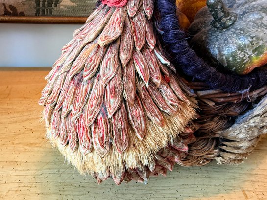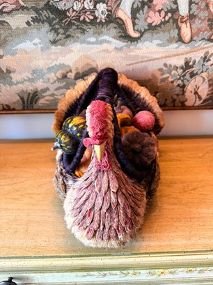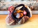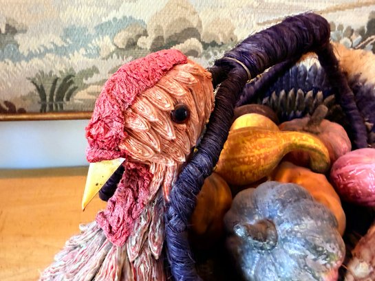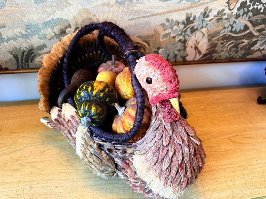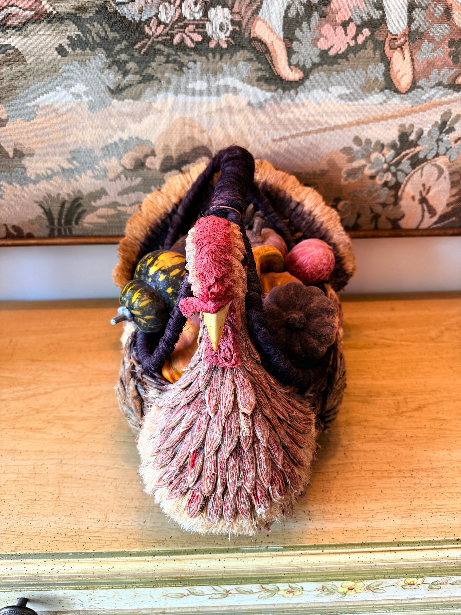 Decorative turkey-shaped basket filled with miniature pumpkins and gourds, often used as a tabletop centerpiece for Thanksgiving or autumn decorations.