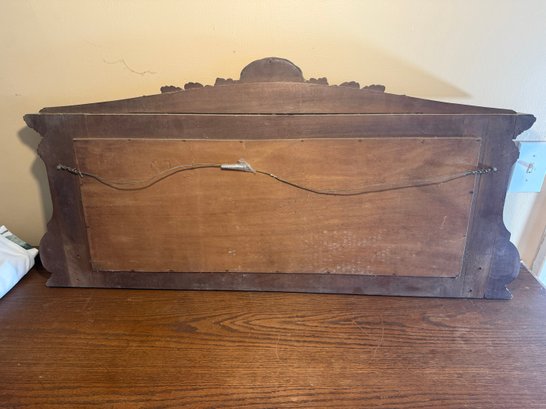 Frame: Features an ornate, dark-finished wooden frame with intricate carvings along the top pediment, including a central shell motif flanked by flowing acanthus leaves.