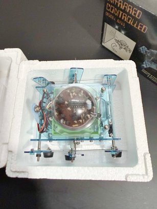 It is a collectible toy featuring a blue and clear plastic robot with a dome-shaped head.