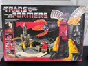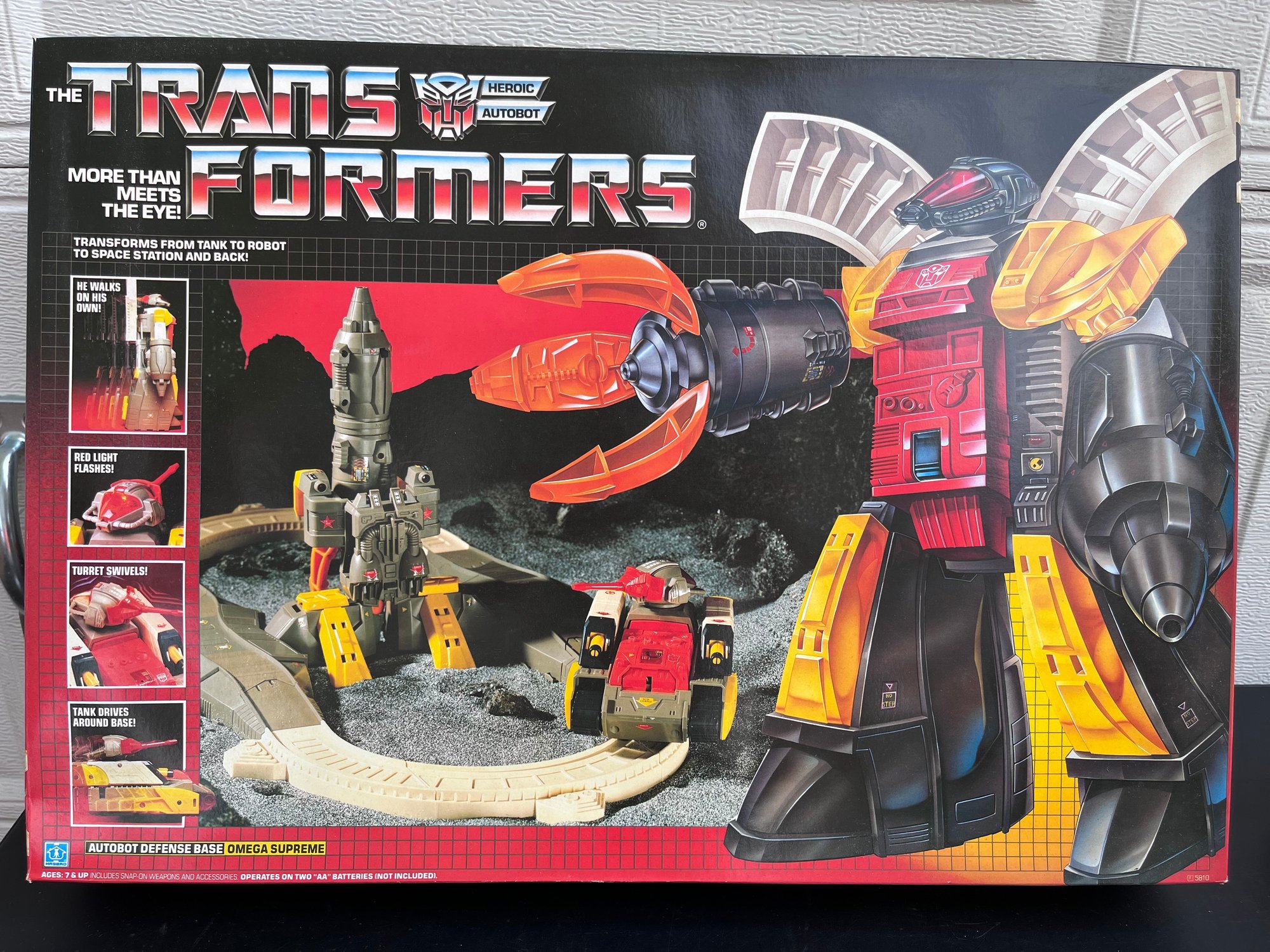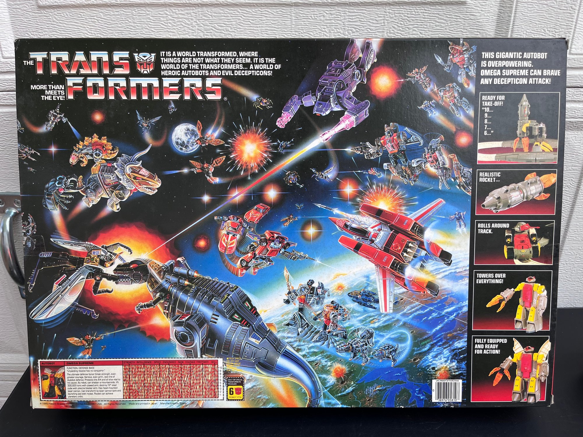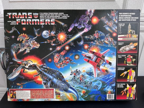 Vintage 1985 Transformers Generation 1 Omega Supreme action figure in its original packaging. As a highly sought-after collectible, it is known for its unique motorized features, including a tank that drives on its own and a turret that swivels. The figure transforms into a rocket, a defense base, and a tank.