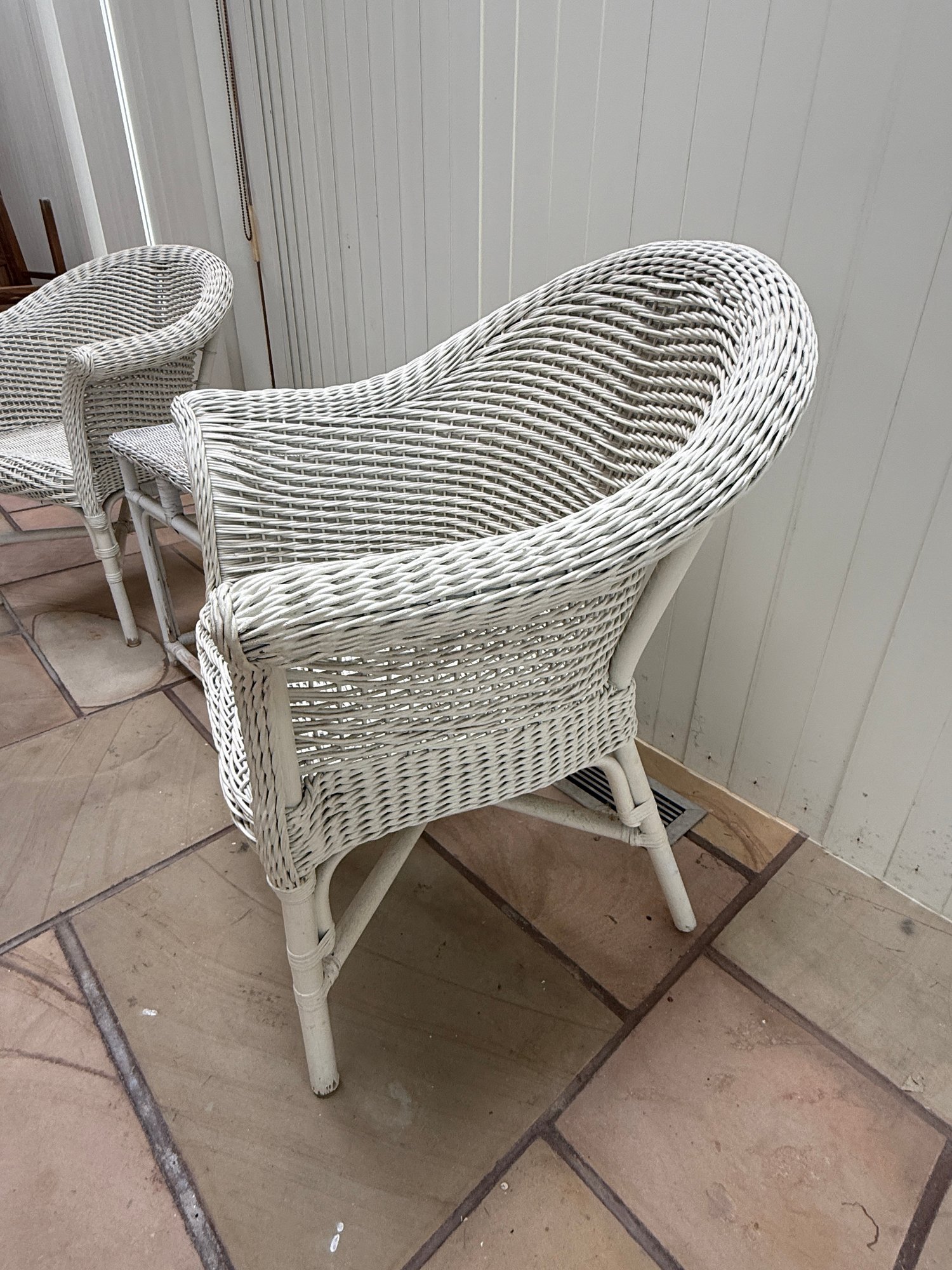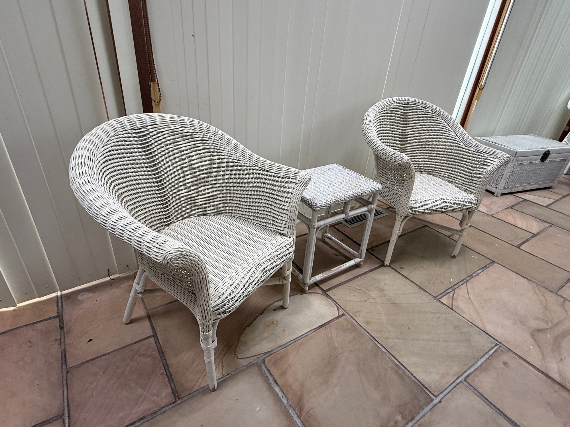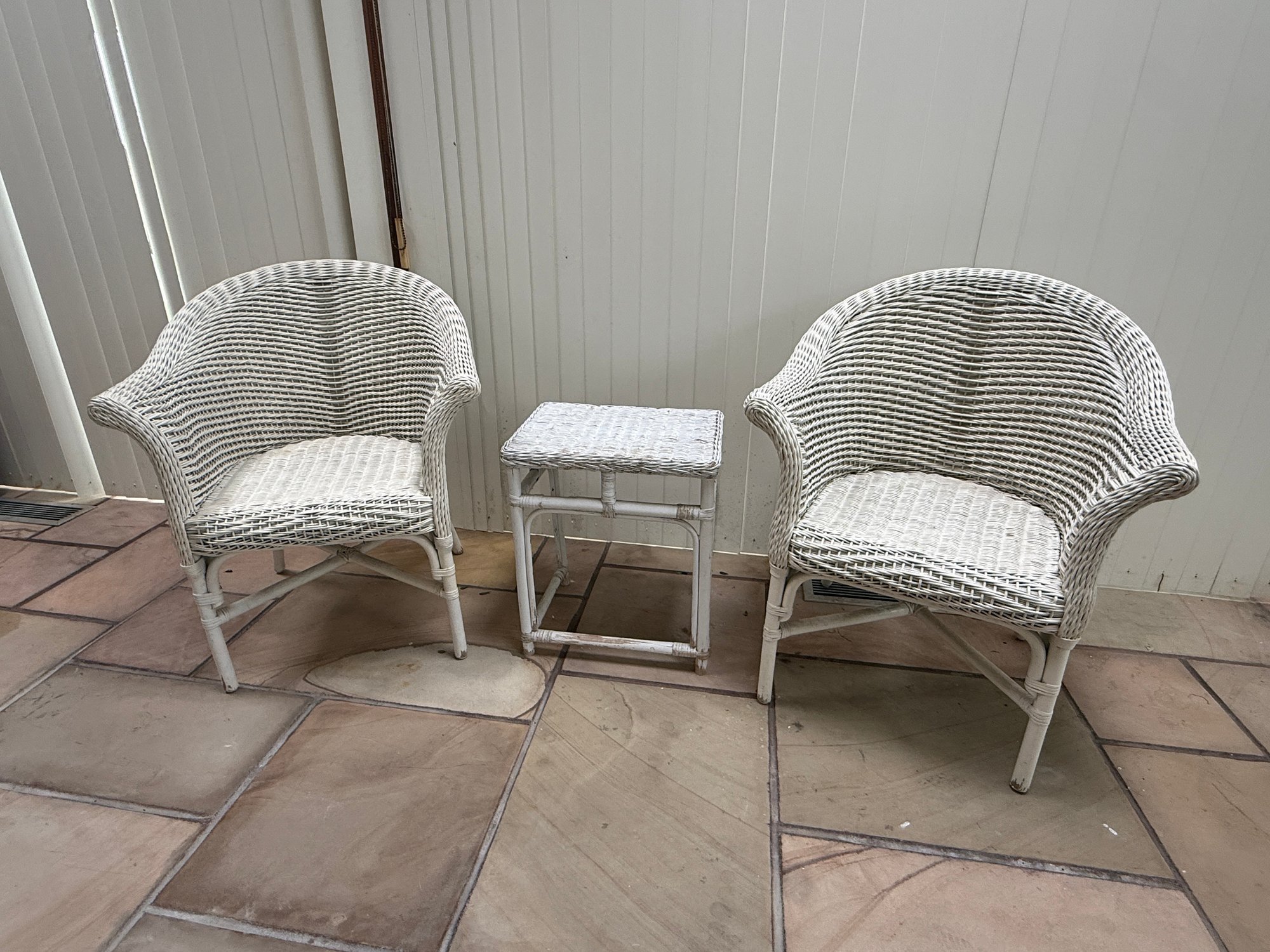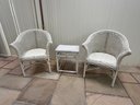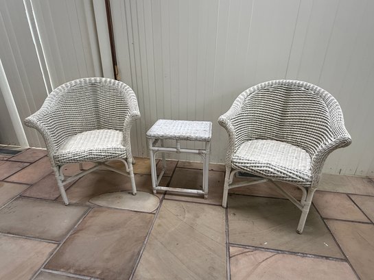 Vintage 3 Piece Wicker Set. That includes two rounded back chairs and a table.