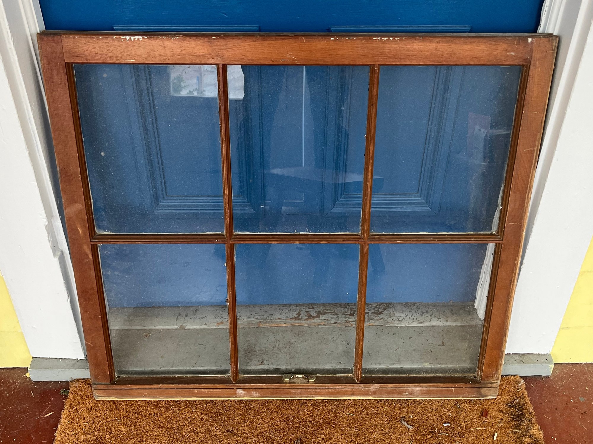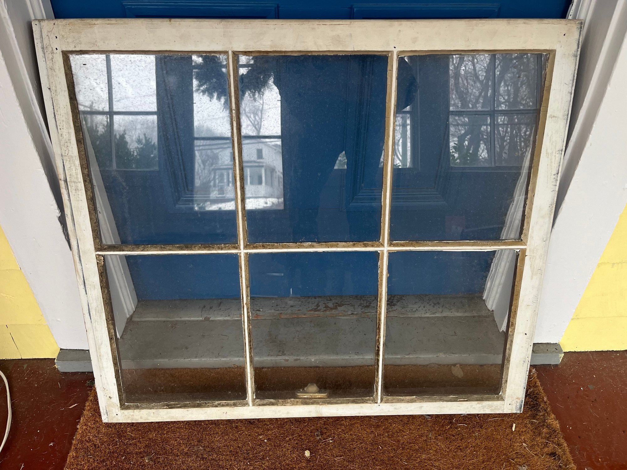 6-pane window sash featuring a white wooden frame and glass panels. Oten repurposed for greenhouses, room dividers, or wall decor. Paint and glaze has chipping, cracks and show signs of its age. However, all of the glasses is intact and without cracks or chips.
