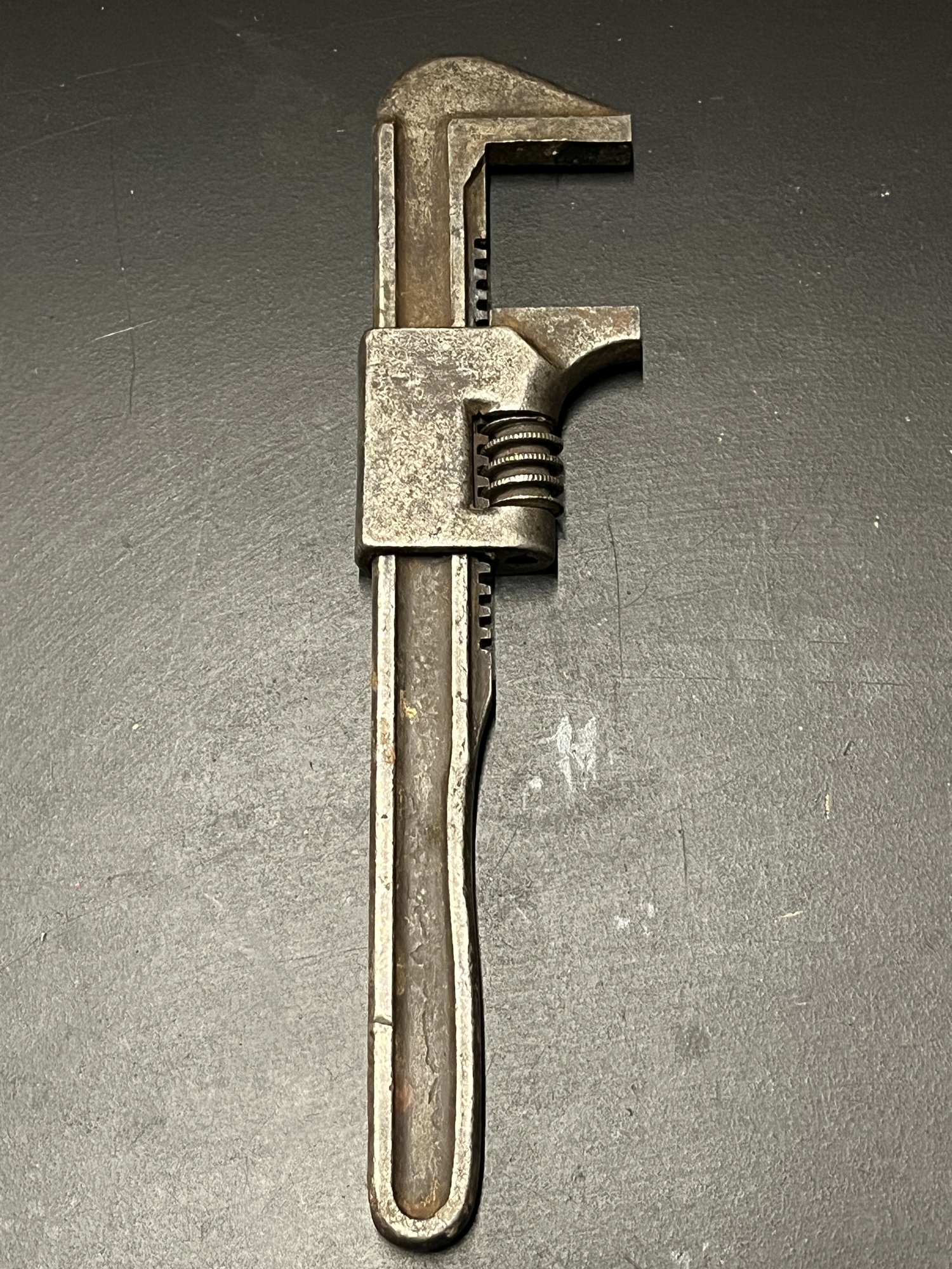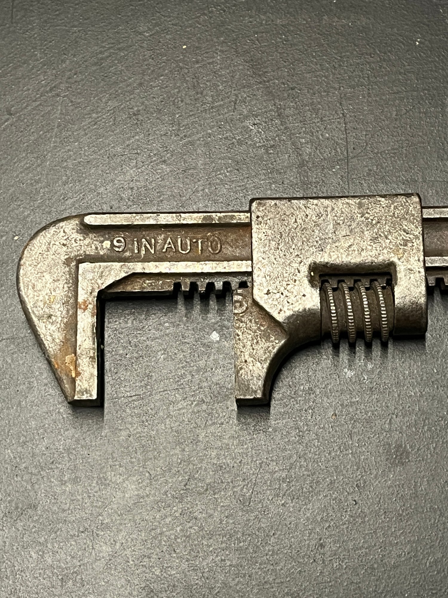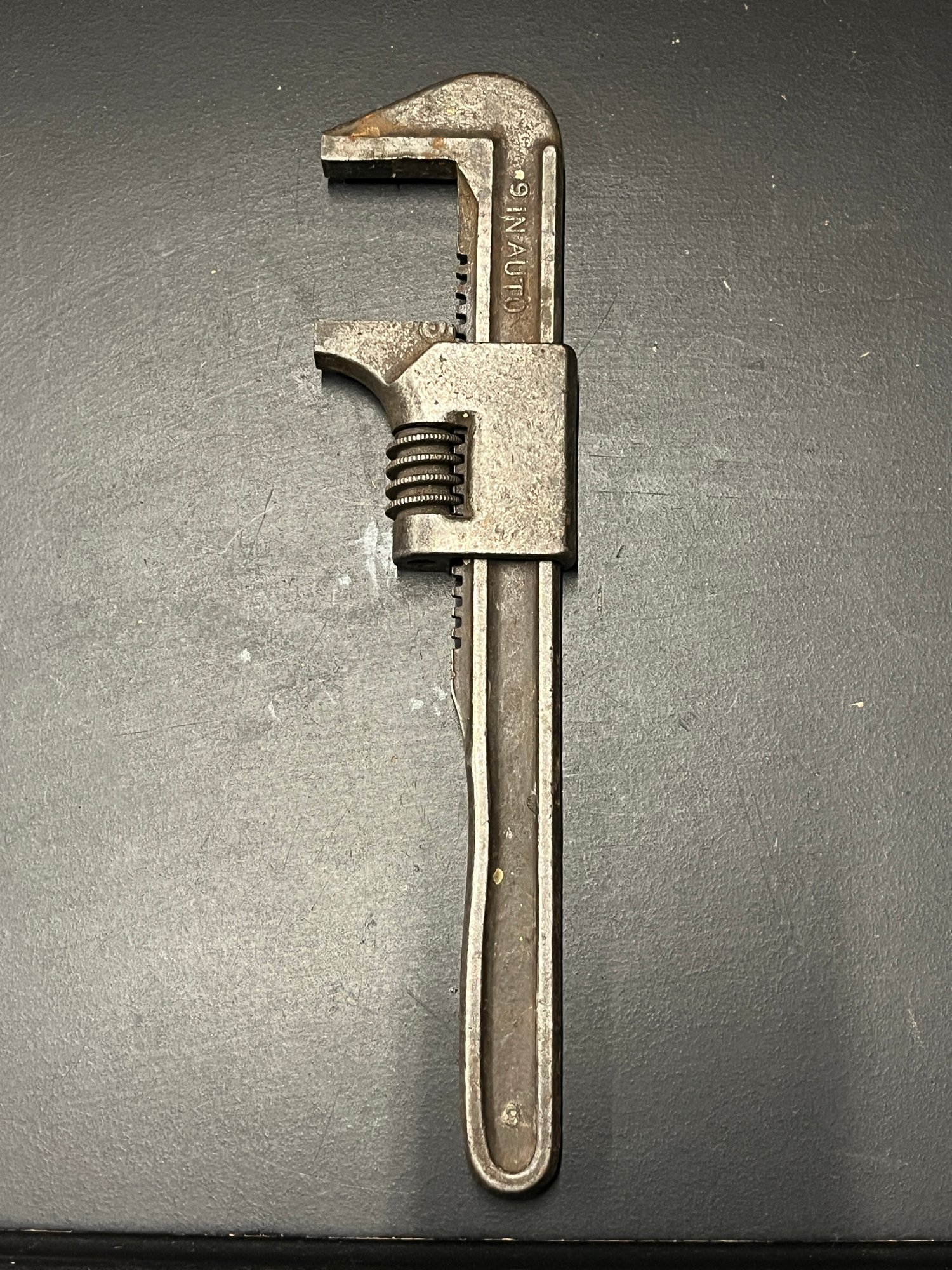 vintage 9-inch "Auto" adjustable wrench, also known as a monkey wrench, likely manufactured in the USA. It's used for gripping and turning nuts and bolts of various sizes. The adjustable jaw allows it to fit different fasteners. 9 inches in length, with a jaw opening up to 2 1/2 inches. Constructed from durable metal, likely with a black oxide finish for corrosion resistance. It's an older tool, possibly from the Ford Model T era, making it a collectible item for tool enthusiasts.