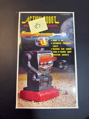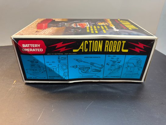 Up for sale is a vintage Action Robot battery-operated toy featuring classic space-age styling, bump-and-go action, and projectile rocket feature.