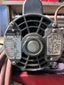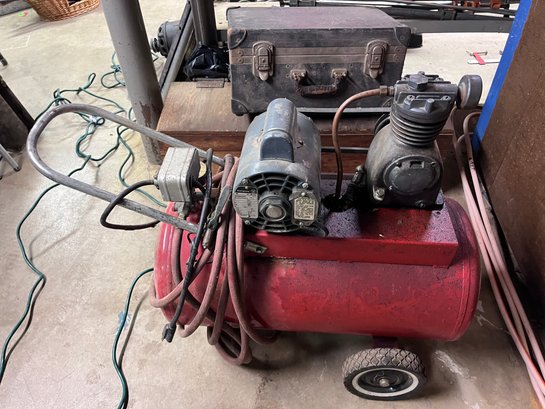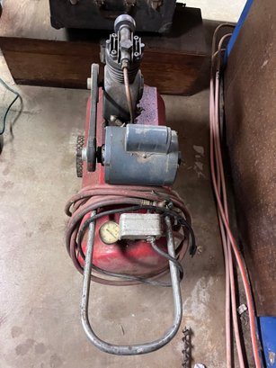 Features: Red horizontal storage tank, electric motor, and a belt-drive system.
