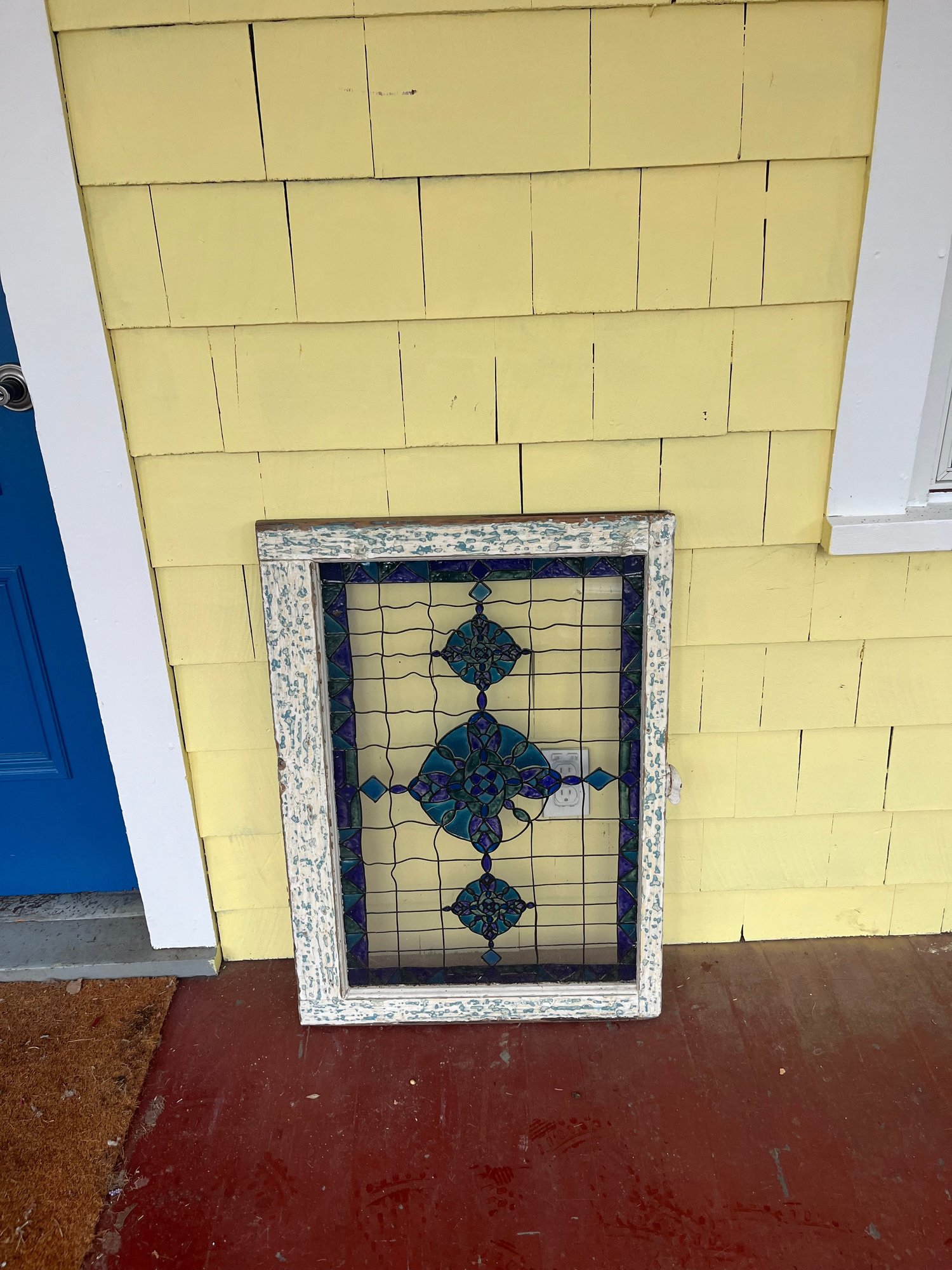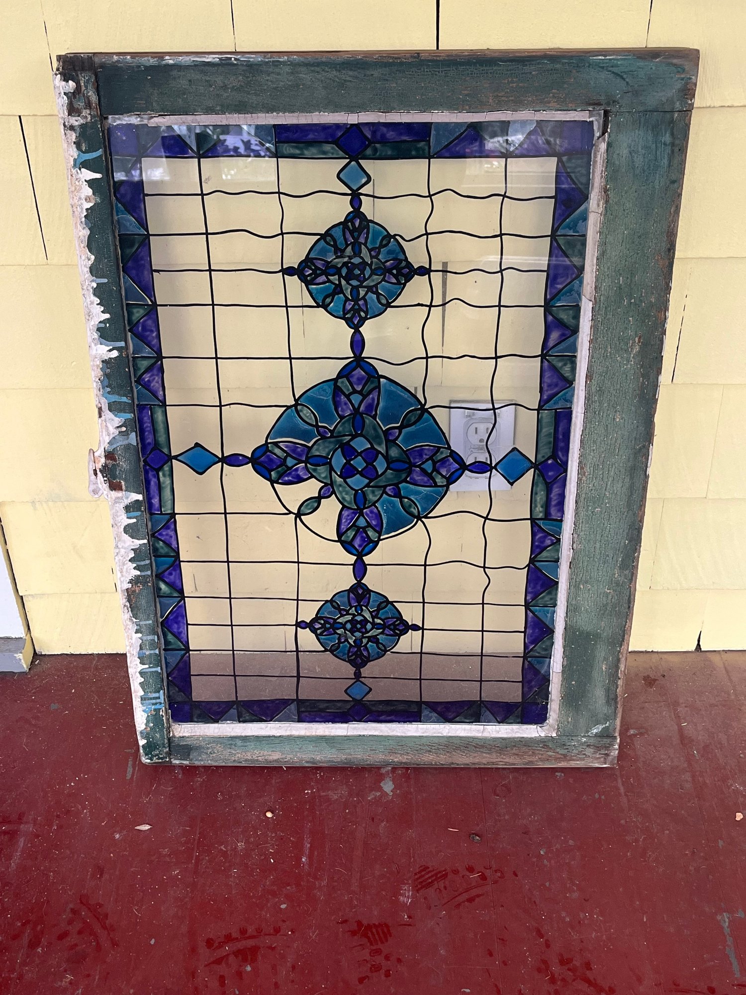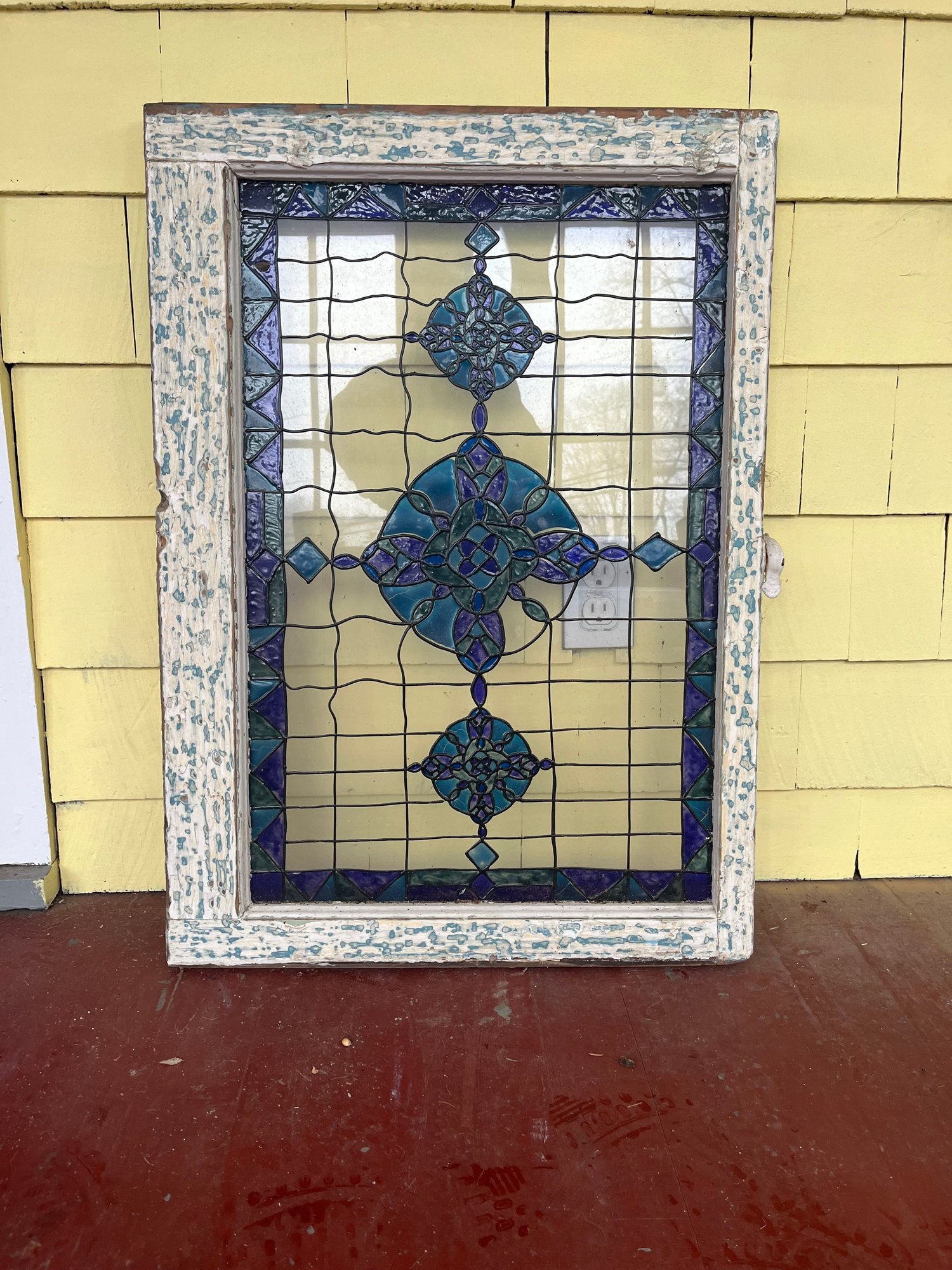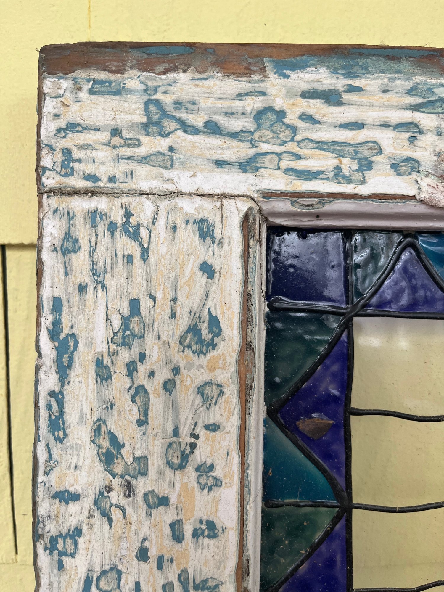 Vintage architectural-style window panel featuring a beautifully weathered, chippy-painted wood frame and decorative colored inset design. The frame shows layers of distressed white and pale blue paint, giving it a wonderfully rustic, timeworn character that adds warmth and authenticity to any space.