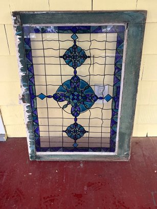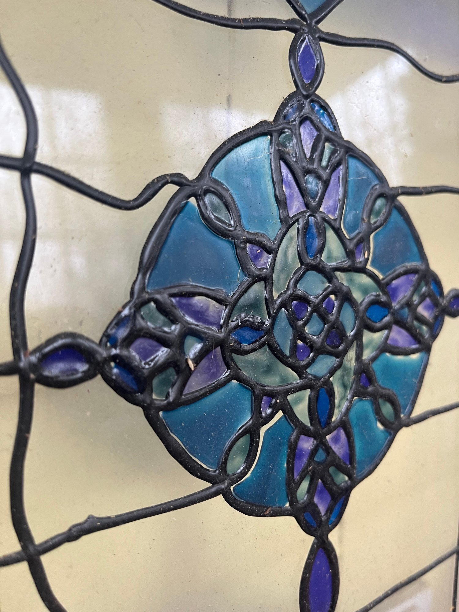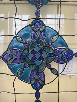 The center panel features a geometric floral motif in rich shades of teal, cobalt, and deep blue set within a grid-style framework. The colored elements appear to be decorative cut inserts rather than traditional stained glass, making this a lightweight and versatile accent piece.
