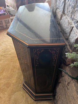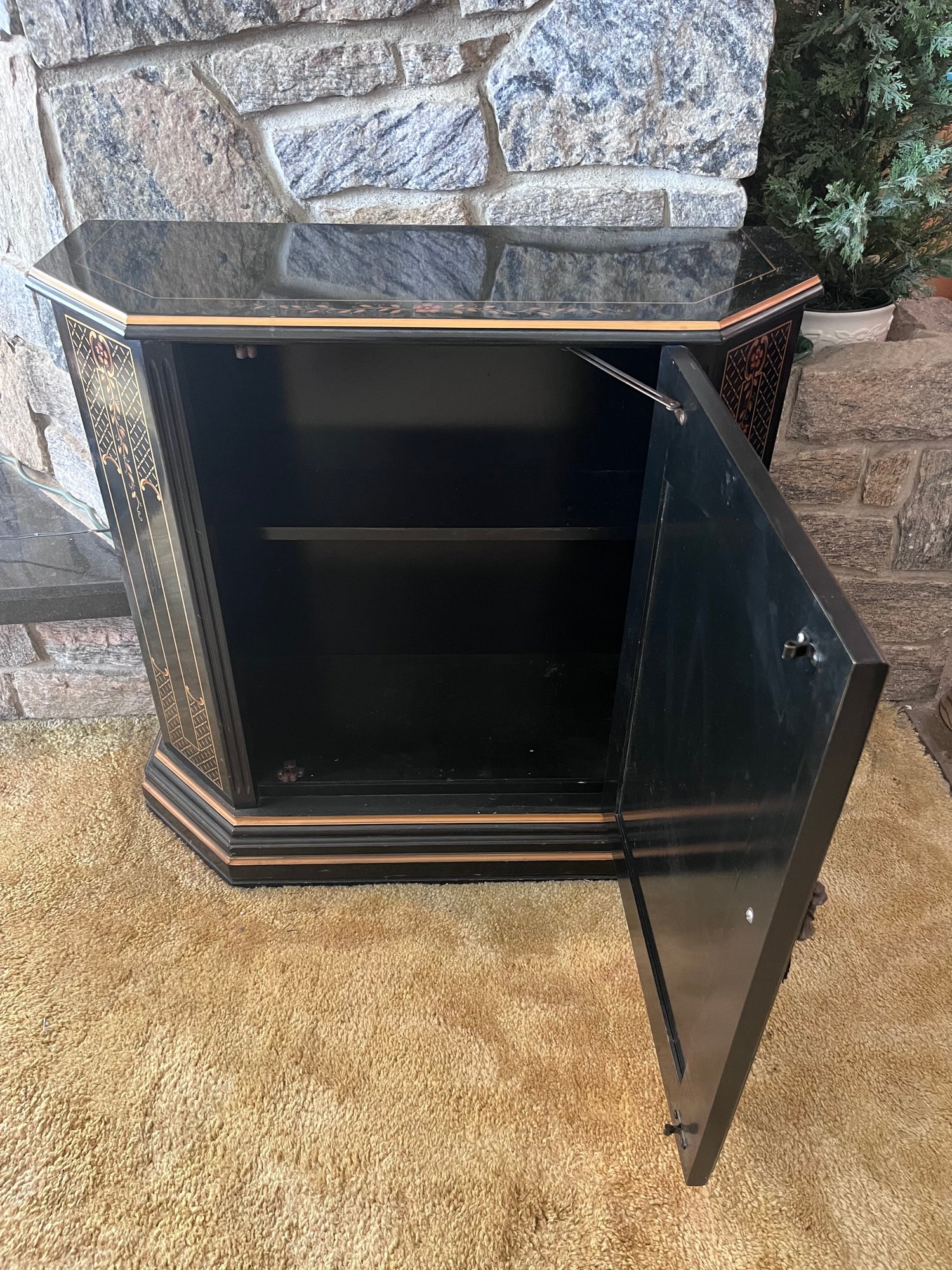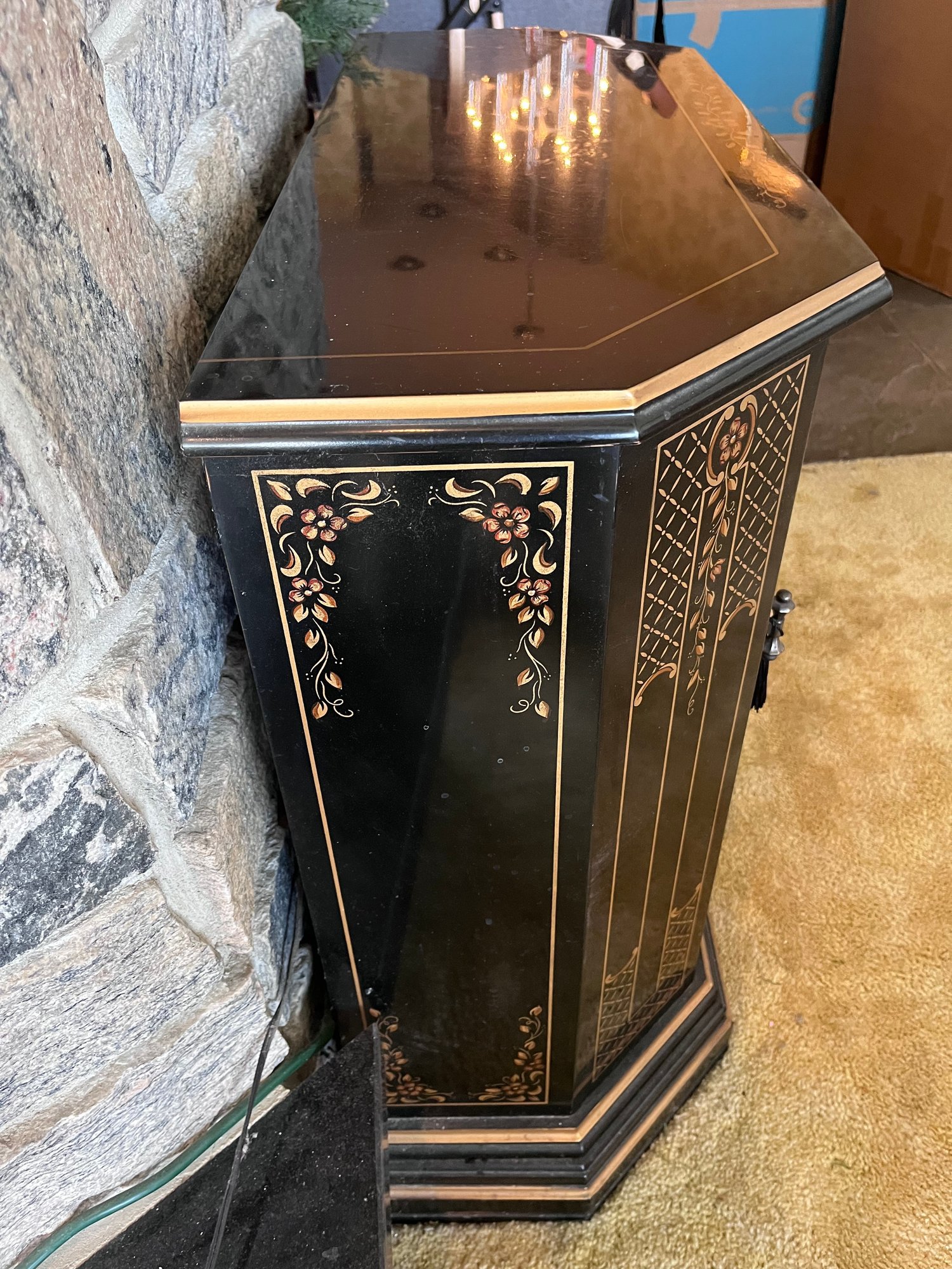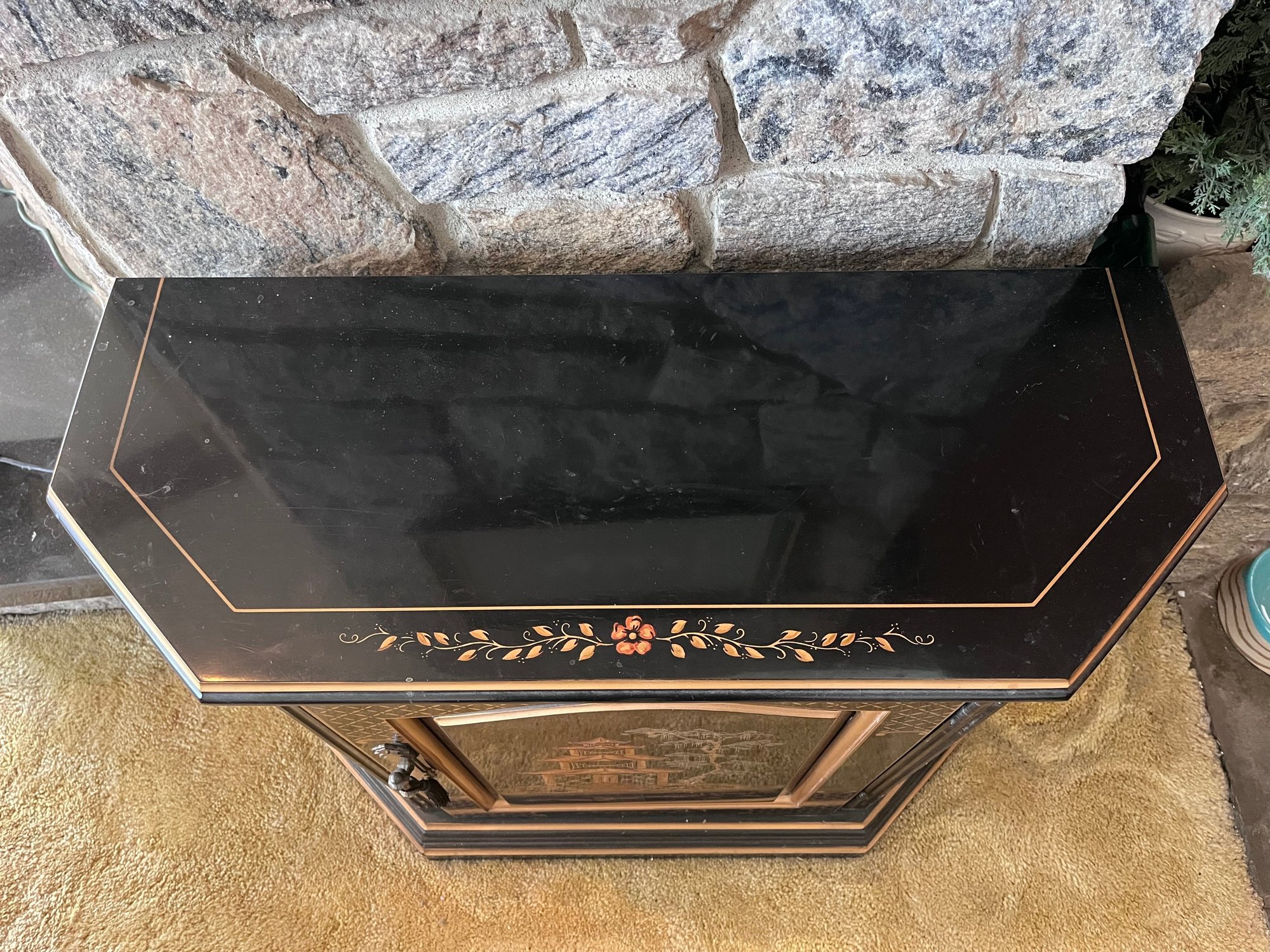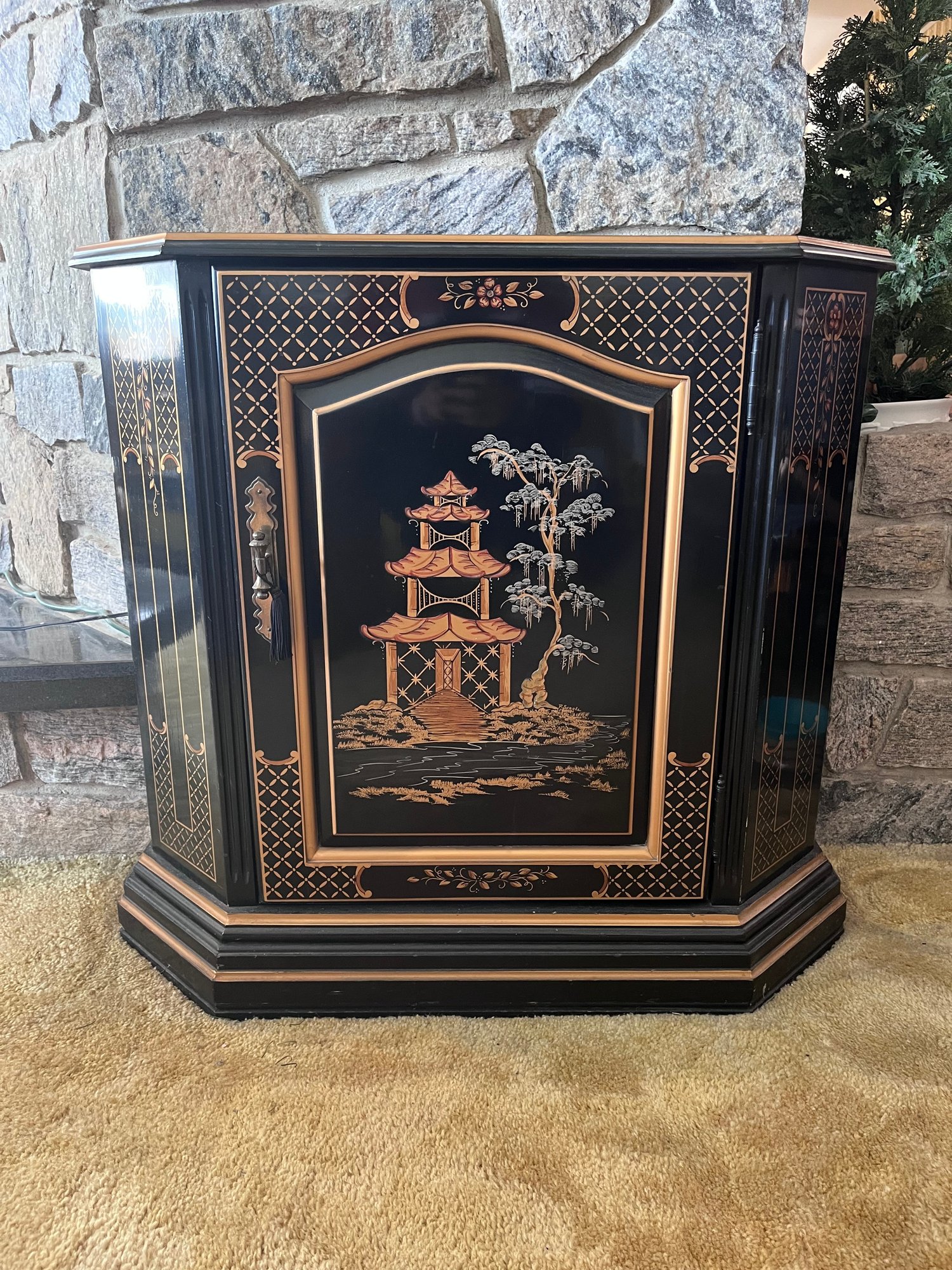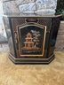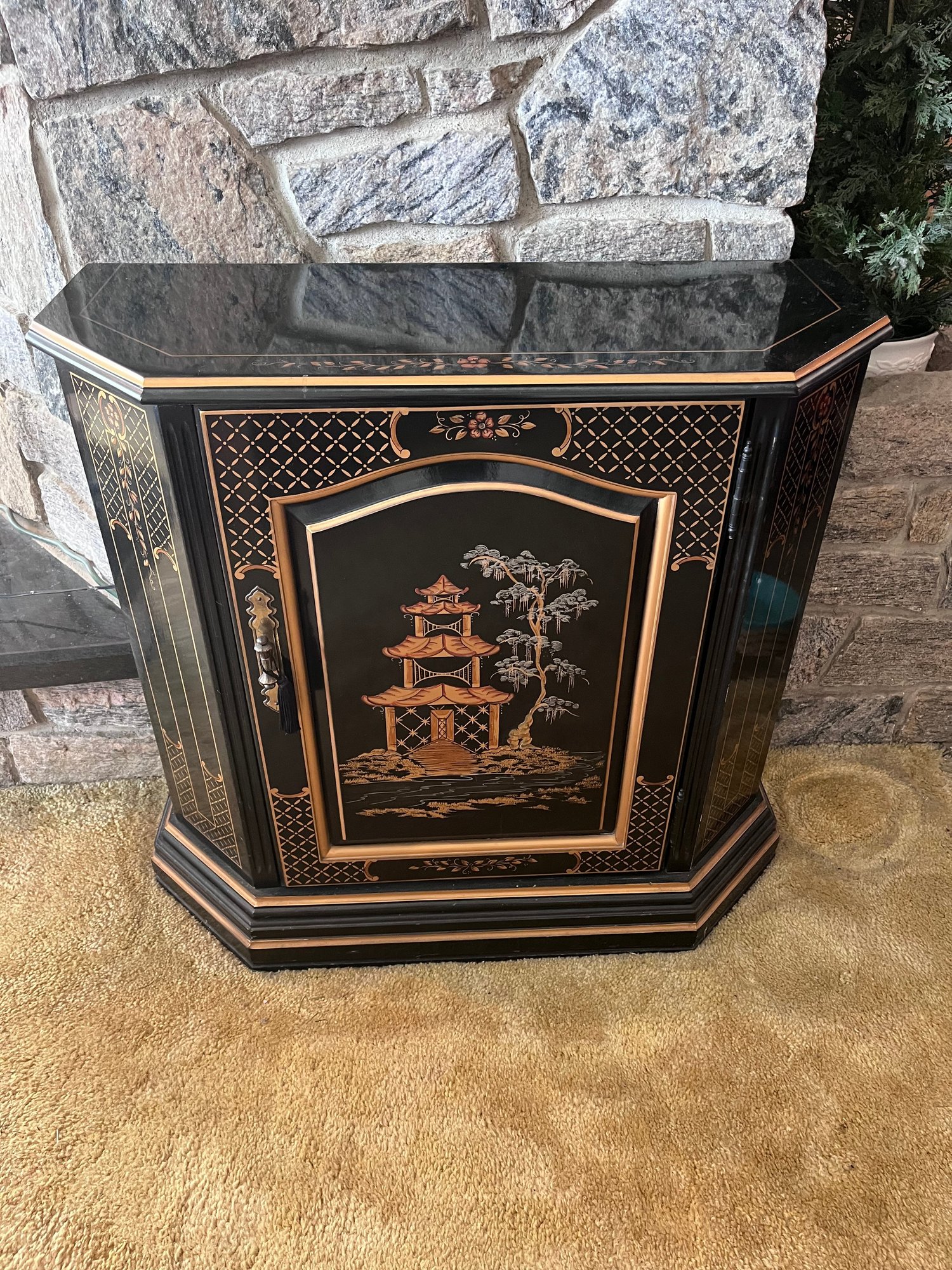 Elegant vintage chinoiserie-style accent cabinet featuring a glossy black lacquer finish with hand-painted gold and copper-tone Asian pagoda landscape motifs. Decorative front door opens to spacious interior storage with fixed shelf. Unique faceted sides and shaped front give it a sophisticated statement look.