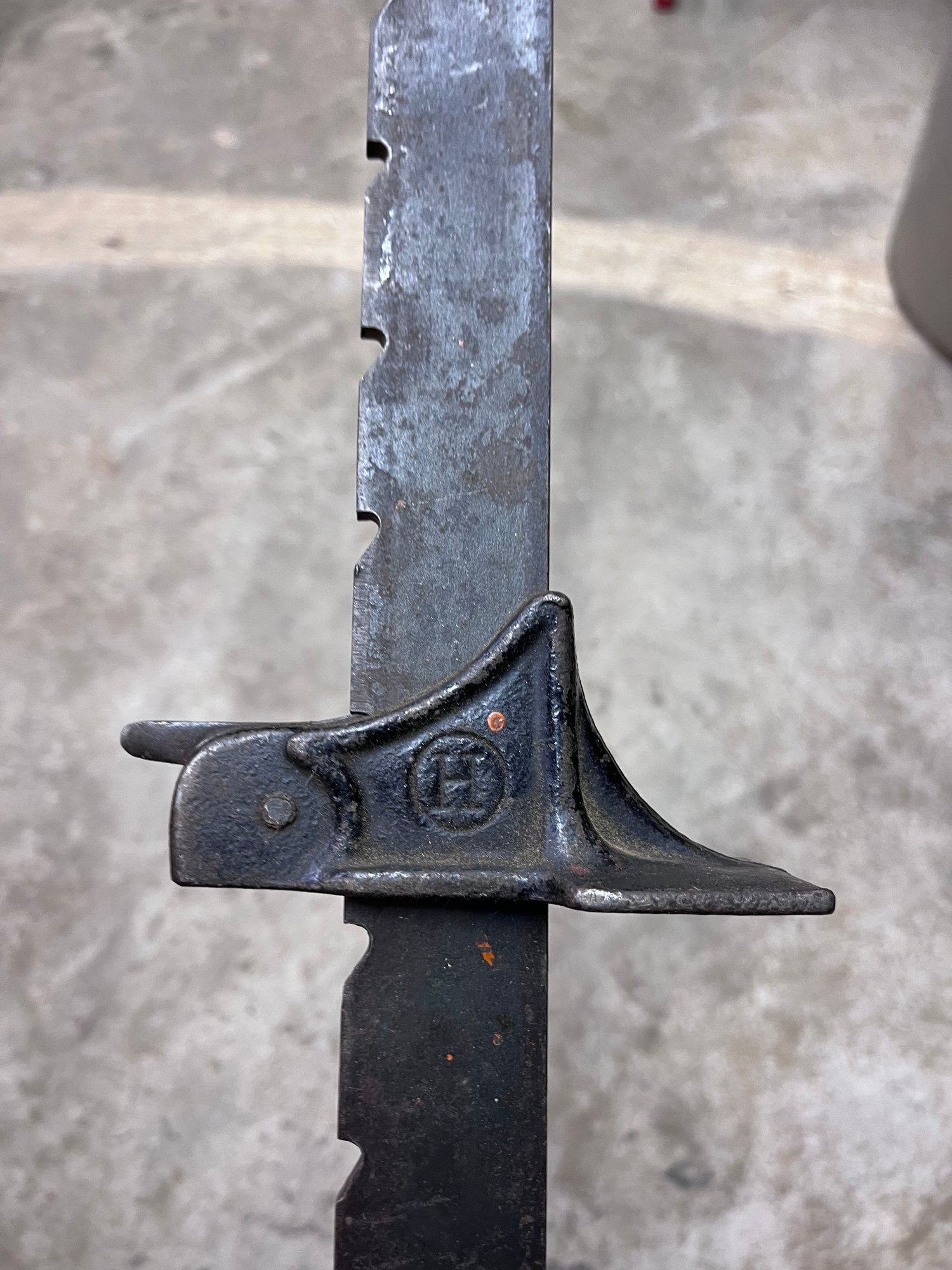 Design: It features a notched steel bar with a fixed screw-end and an adjustable "dog" (the sliding part) that locks into the notches along the bar.