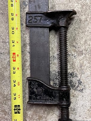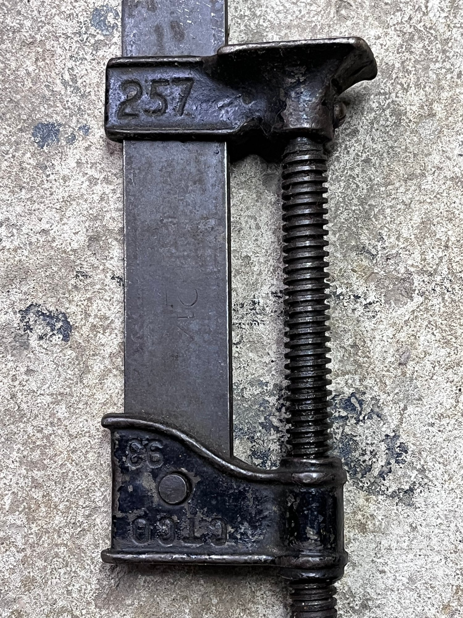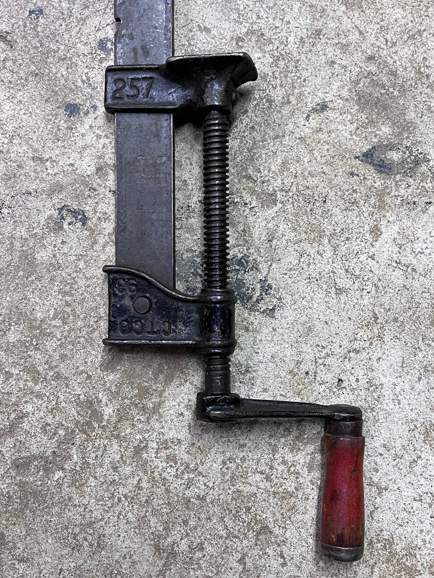 Vintage bar clamp, specifically a model often identified as a "CT CO" (Cincinnati Tool Company) No. 93. These are heavy-duty woodworking tools used for large glue-ups, panel assembly, or cabinet making.