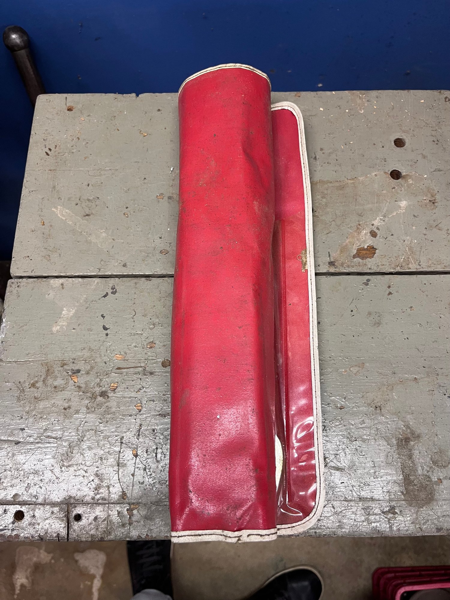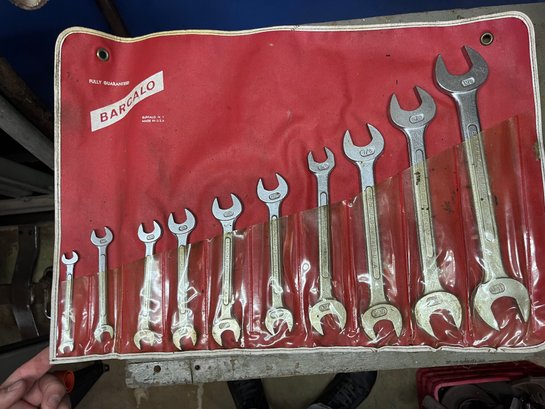 Barcalo Buffalo open-end wrench set in a red pouch, likely manufactured in the mid-20th century.