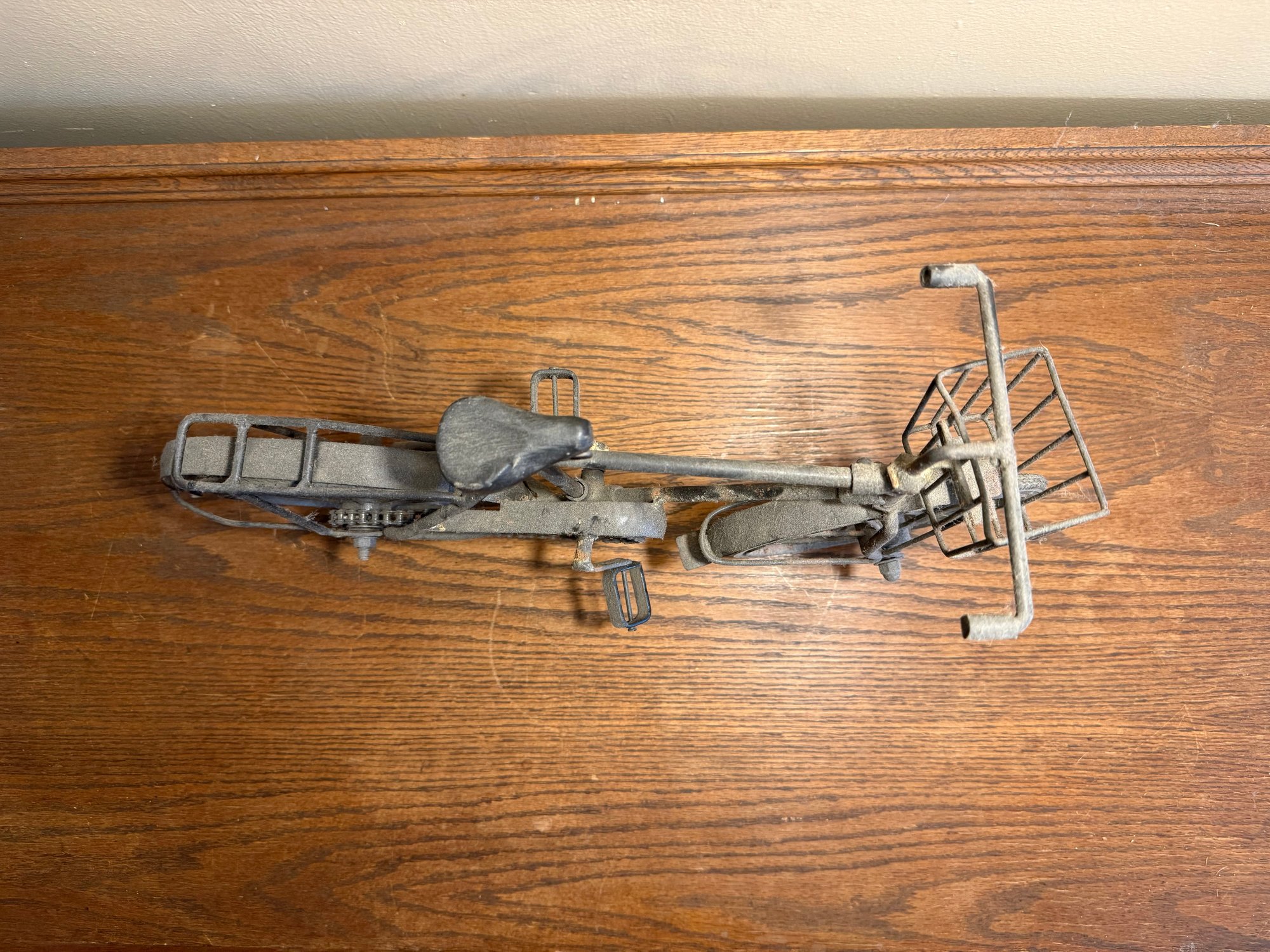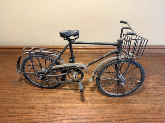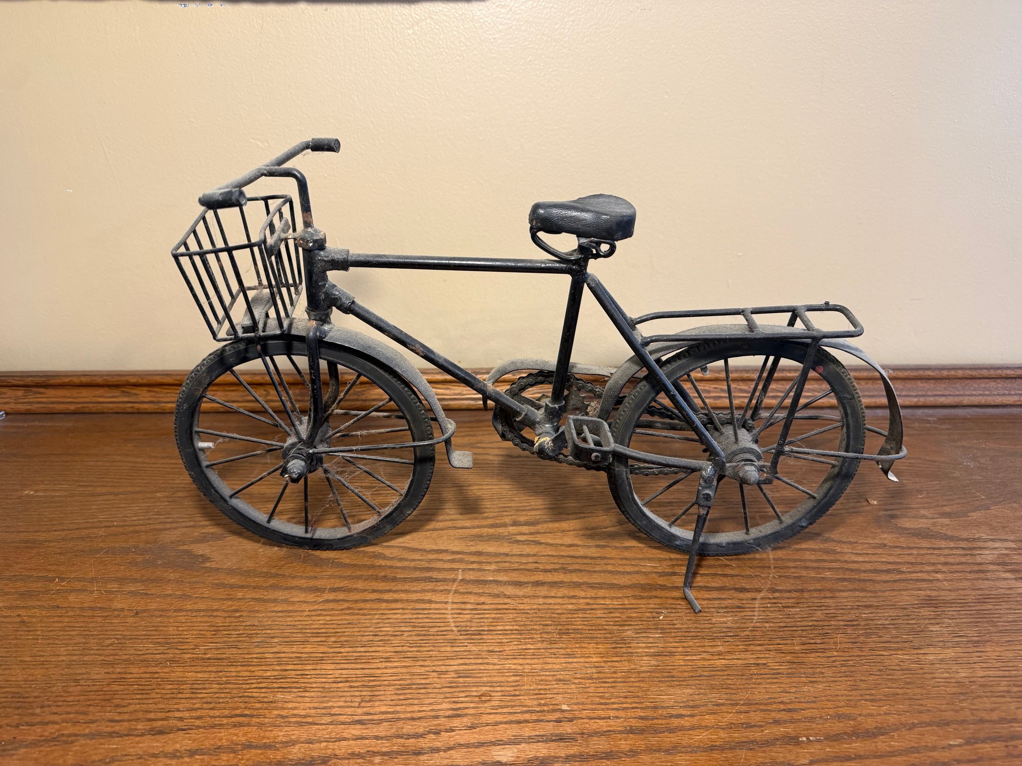 Design and Details: This piece is highly detailed, including a front basket, rear cargo rack, handlebars, pedals, and seat, replicating a real bicycle.