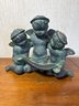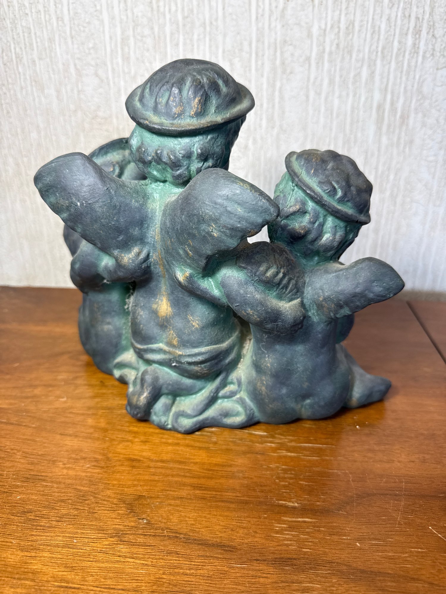 Three winged, chubby child figures holding a scroll or banner.