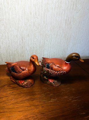 Set of ceramic duck figurines. Features detailed feather textures with a warm brown, blue and green painted finish.