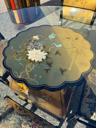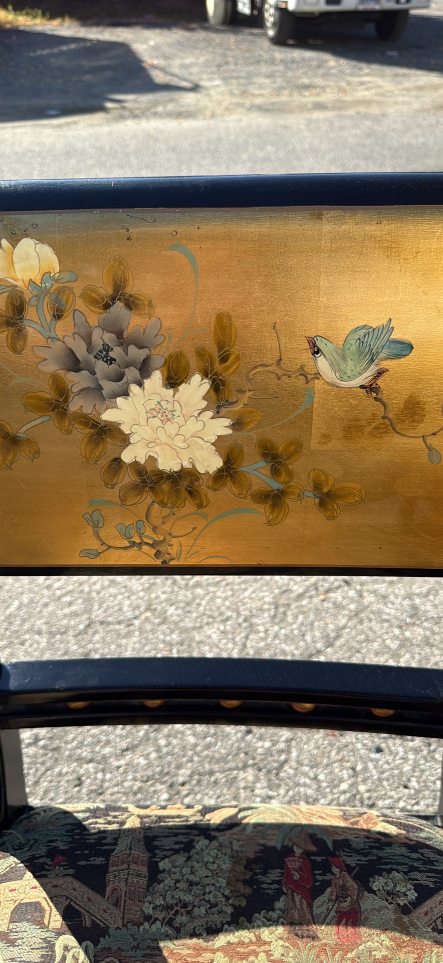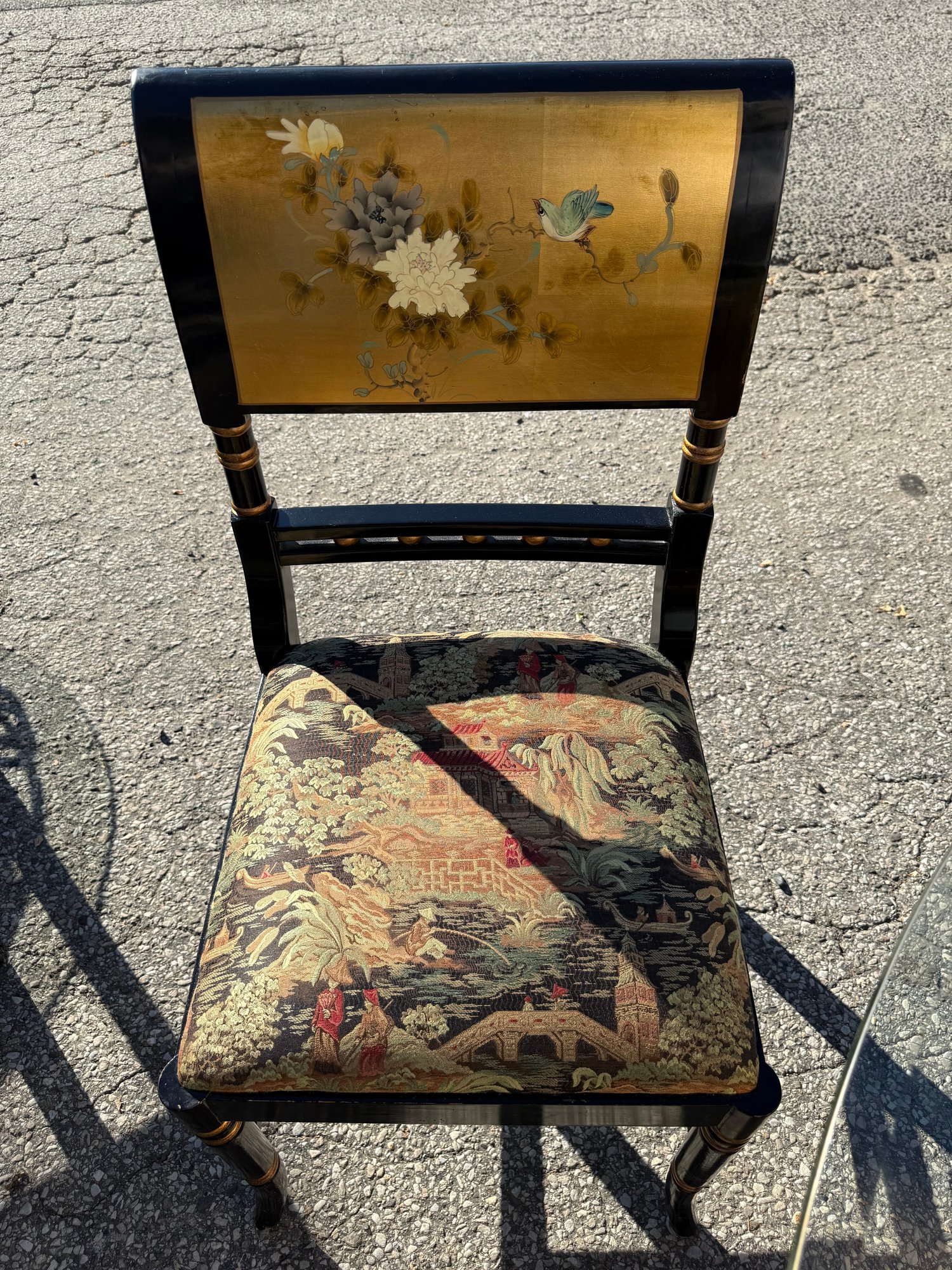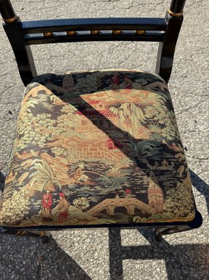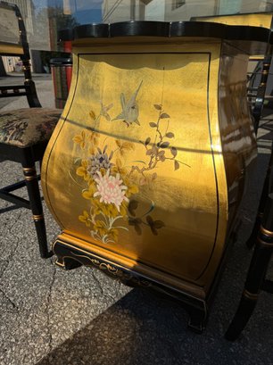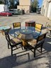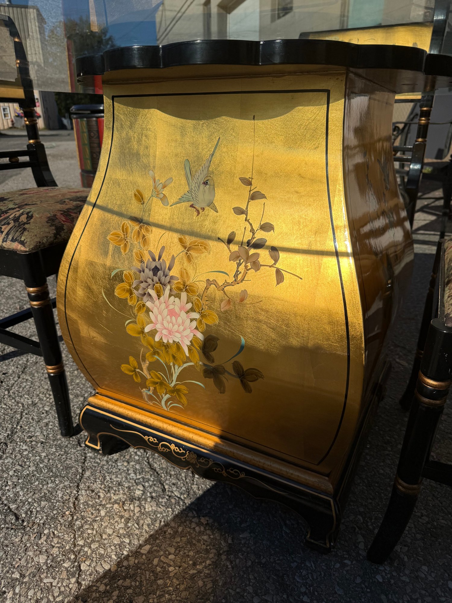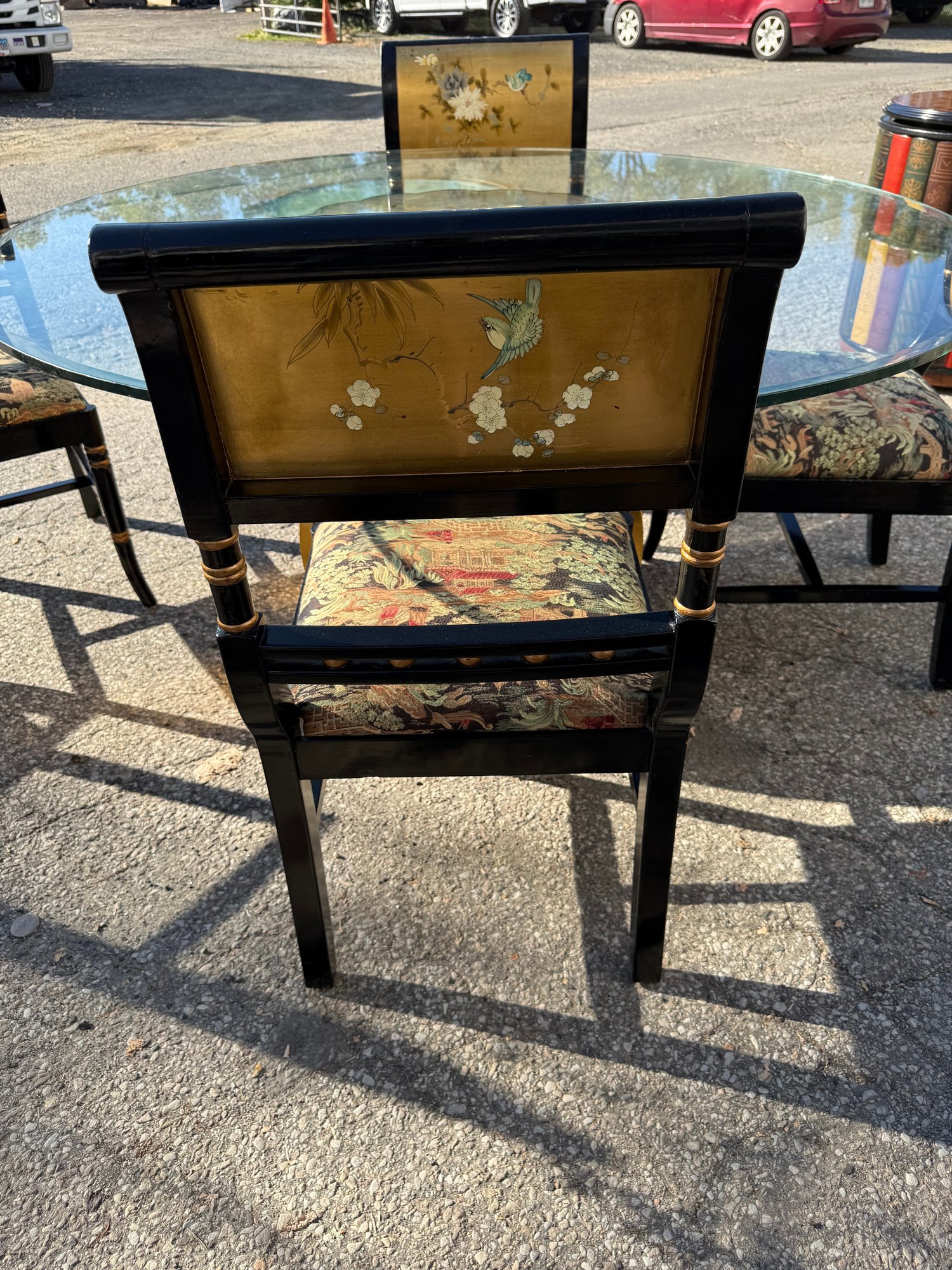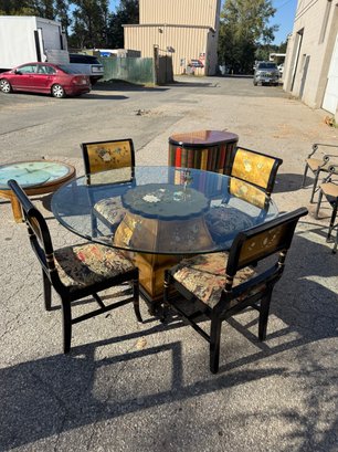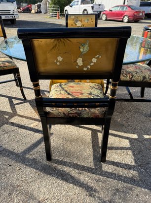 Vintage Chinese black lacquer and embossed gold painted dining room table and chair chairs. Table is 60 inches wide and 30 1/2 inches high. Includes four chairs, 19 1/2 inches wide, 19 inches deep, 18 1/2 inches high two seats and backrest is 38 inches high.
