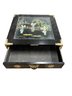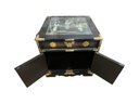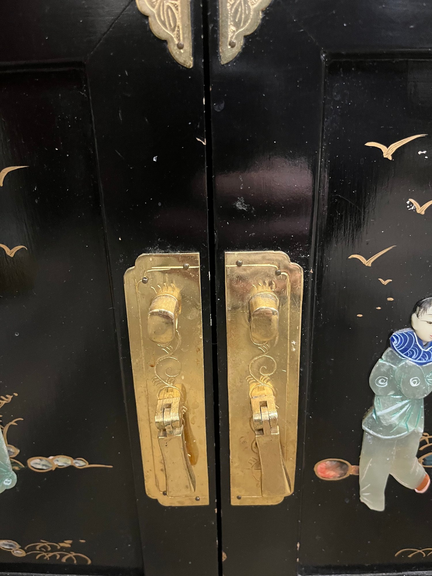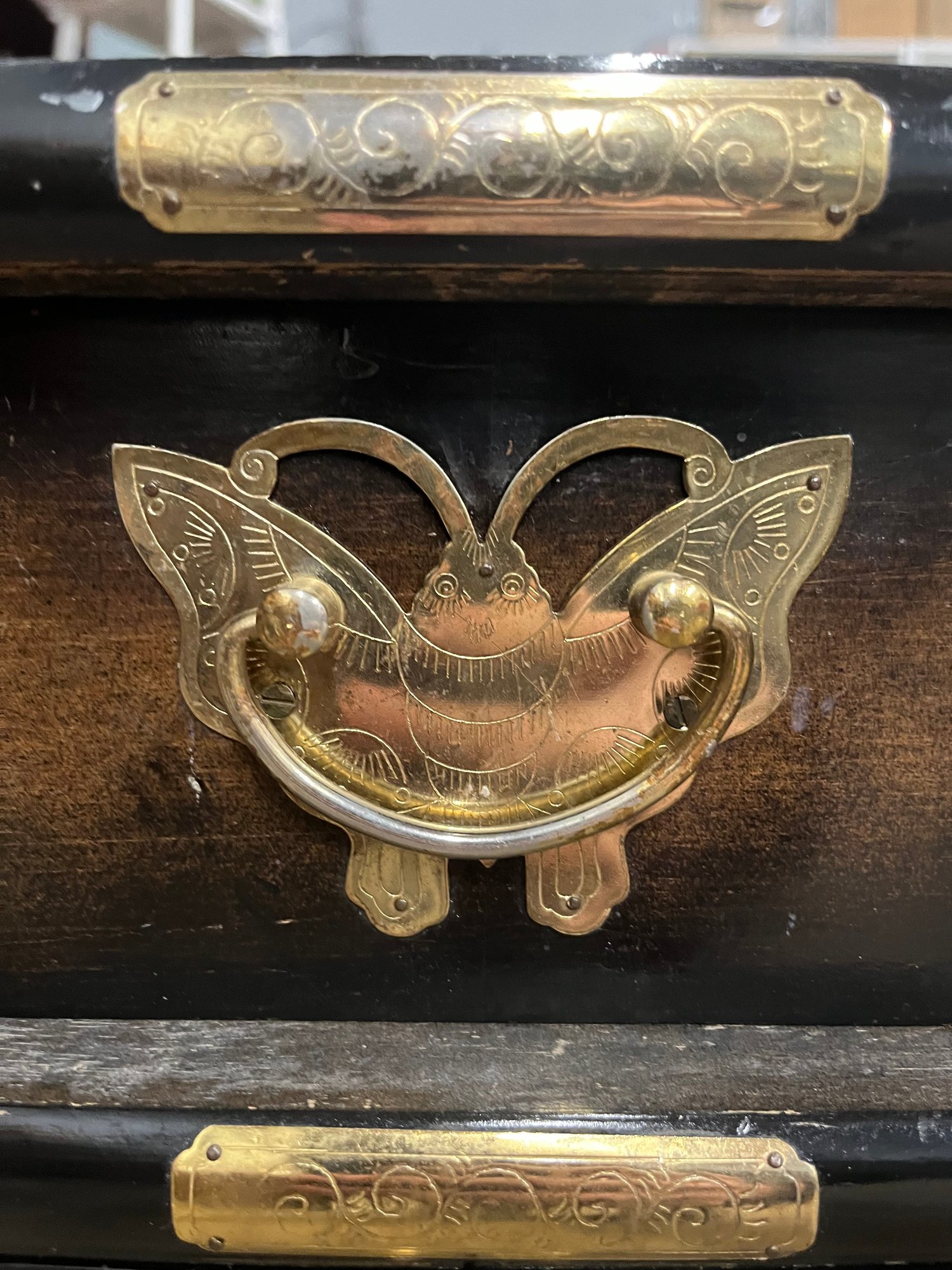The cabinet is adorned with etched brass hardware, including protective corners, butterfly-shaped handles, and decorative plates.