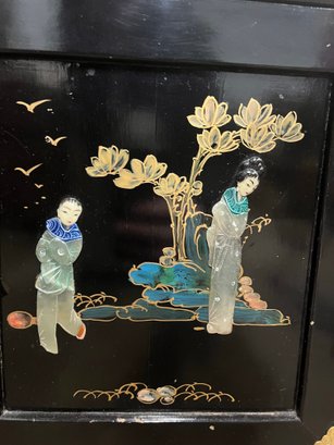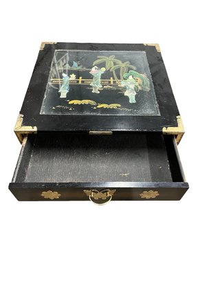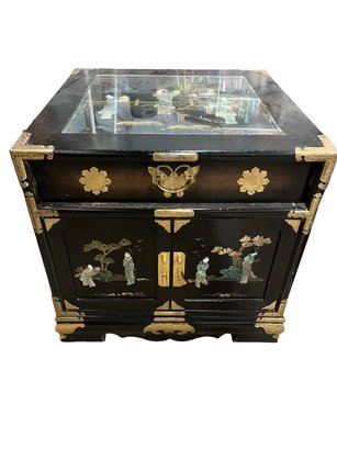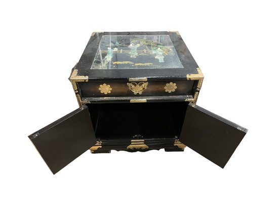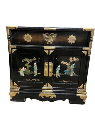 Vintage Chinese black lacquer cabinet, often referred to as a Chinoiserie style end table. It features a traditional black lacquer finish with mother-of-pearl inlays depicting figural scenes and hand-painted traditional scenery.