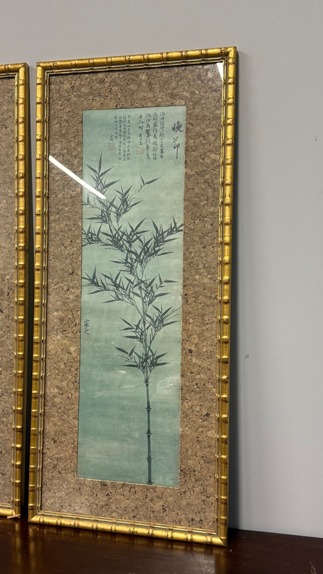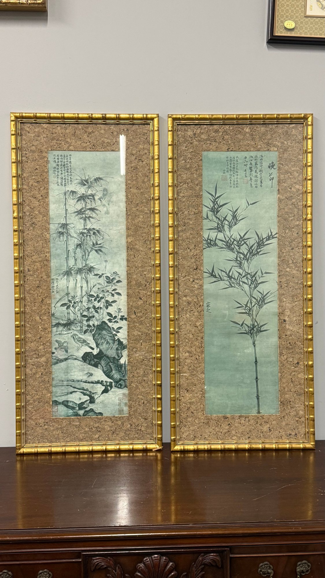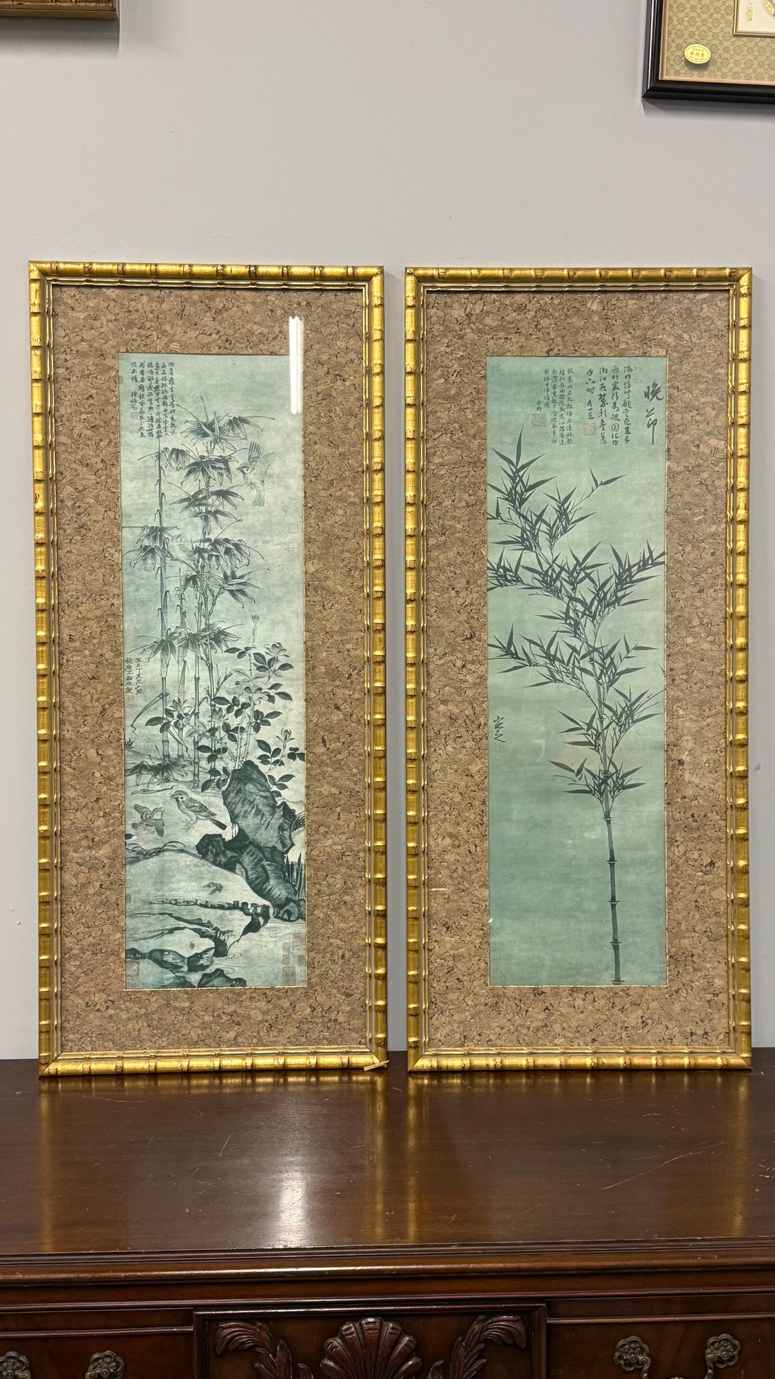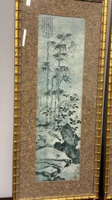 Elegant and timeless, this striking pair of vintage Chinese ink-style bamboo artworks brings classic Asian influence into any interior. Each vertical panel features traditional brushwork compositions — one showcasing a graceful single bamboo stalk with calligraphy, the other a detailed landscape scene with bamboo, birds, and natural rock elements.