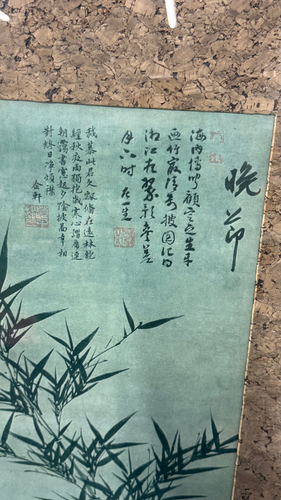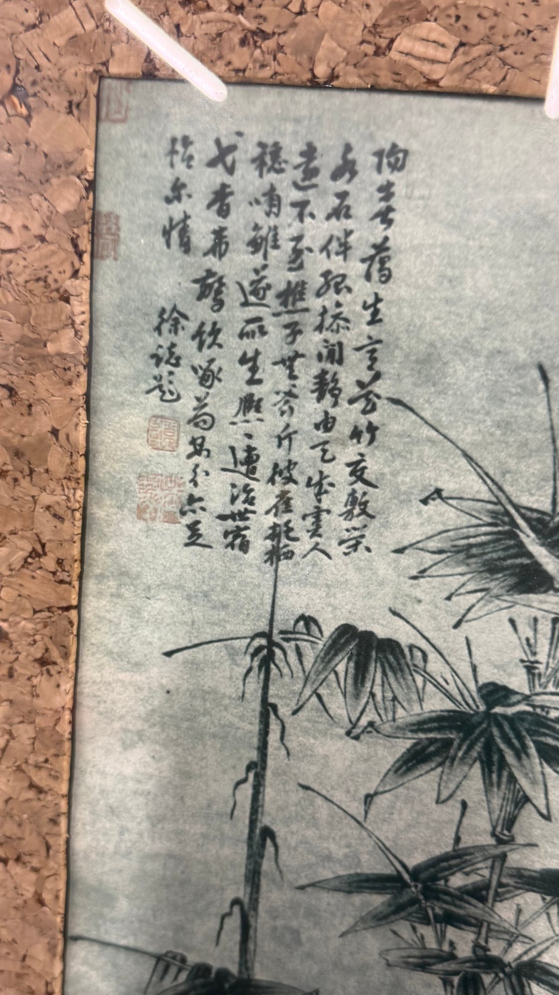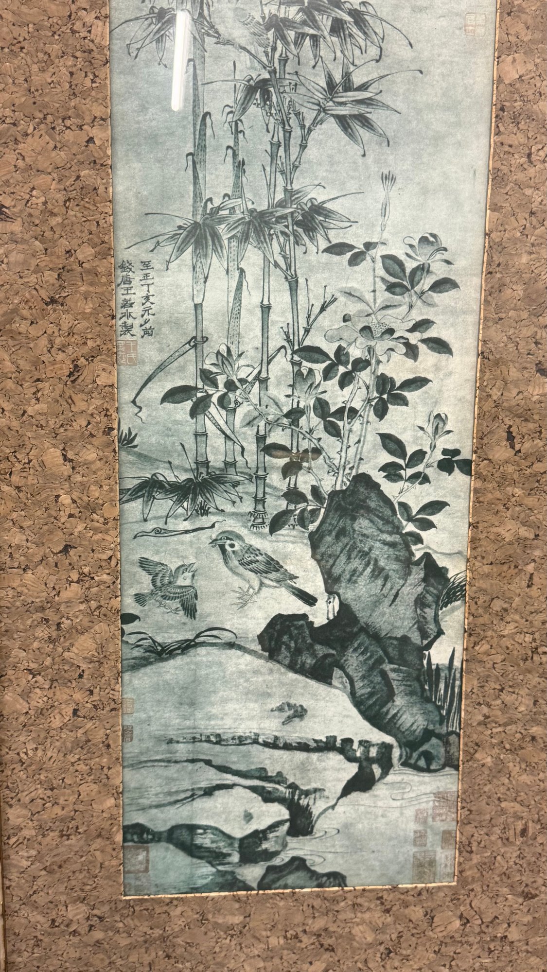 Elegant and timeless, this striking pair of vintage Chinese ink-style bamboo artworks brings classic Asian influence into any interior. Each vertical panel features traditional brushwork compositions — one showcasing a graceful single bamboo stalk with calligraphy, the other a detailed landscape scene with bamboo, birds, and natural rock elements.