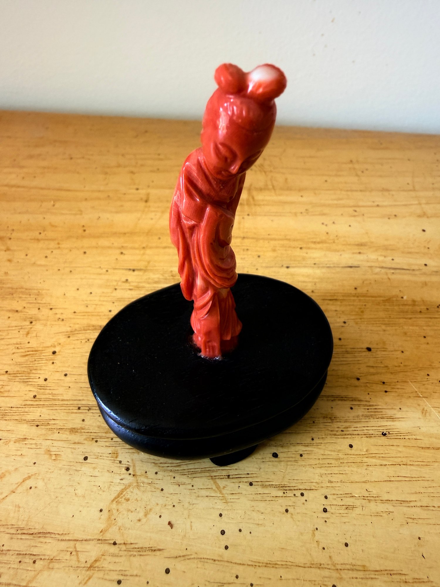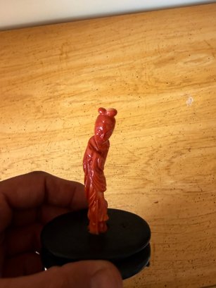 Vintage Chinese red coral carving, depicting a deity such as Guan Yin or a figure from Chinese mythology, displayed on a fitted black wooden stand.