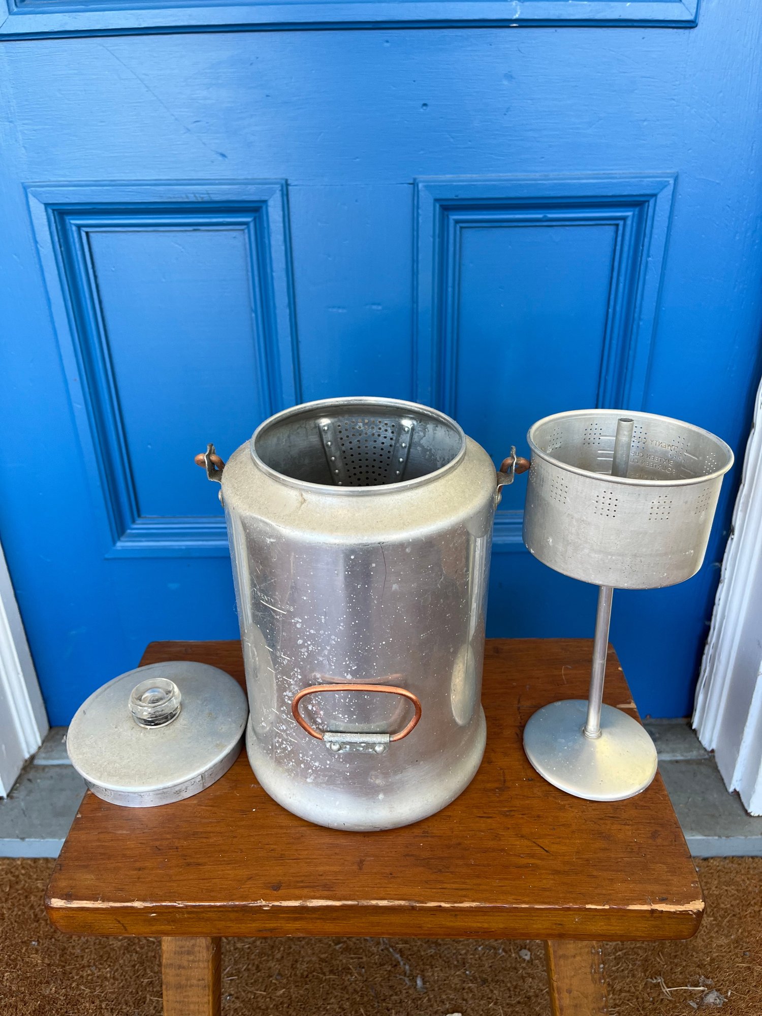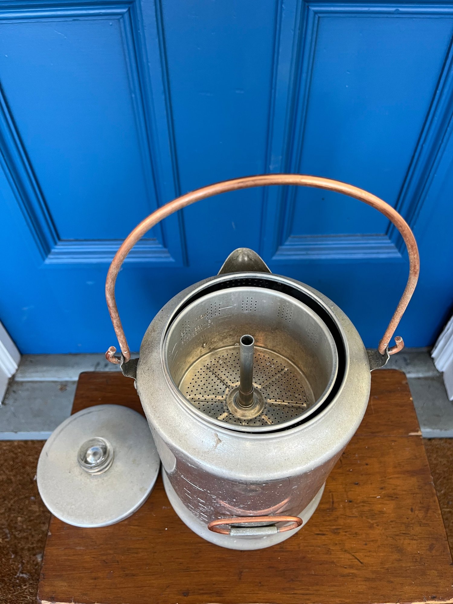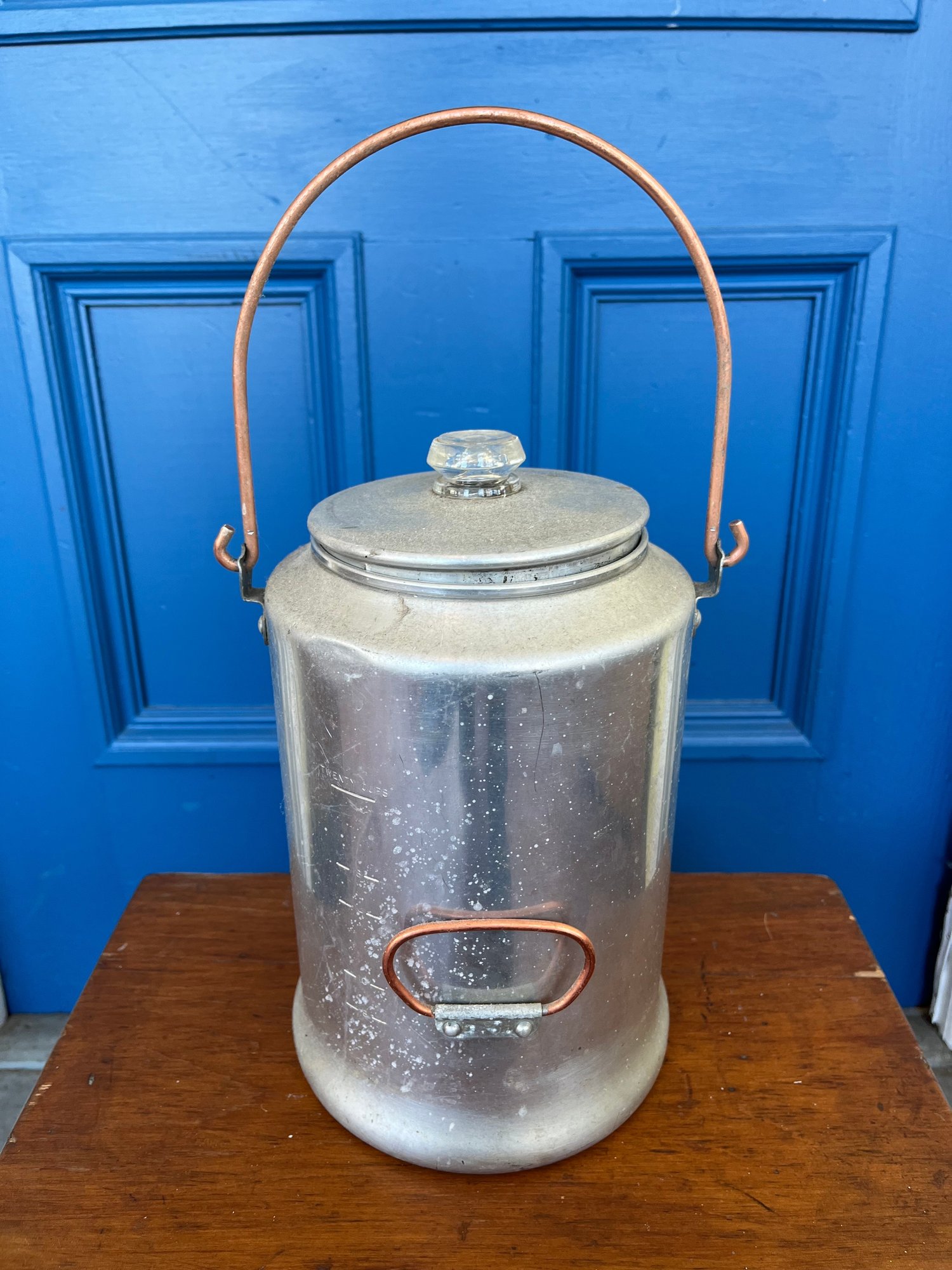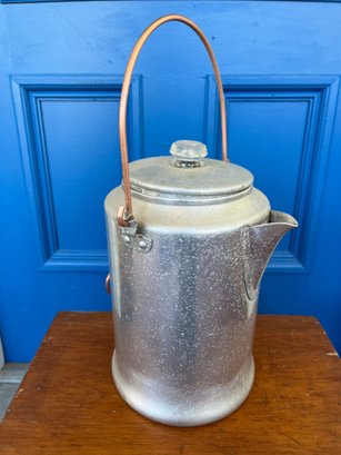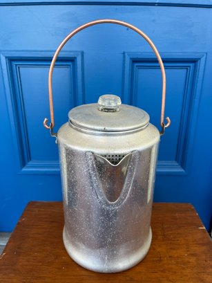 Vintage Comet aluminum percolator coffee pot, likely from the 1950s or 1960s, designed for camping or cabin use. Lightweight aluminum body with a copper bail handle for easy carrying over a campfire.