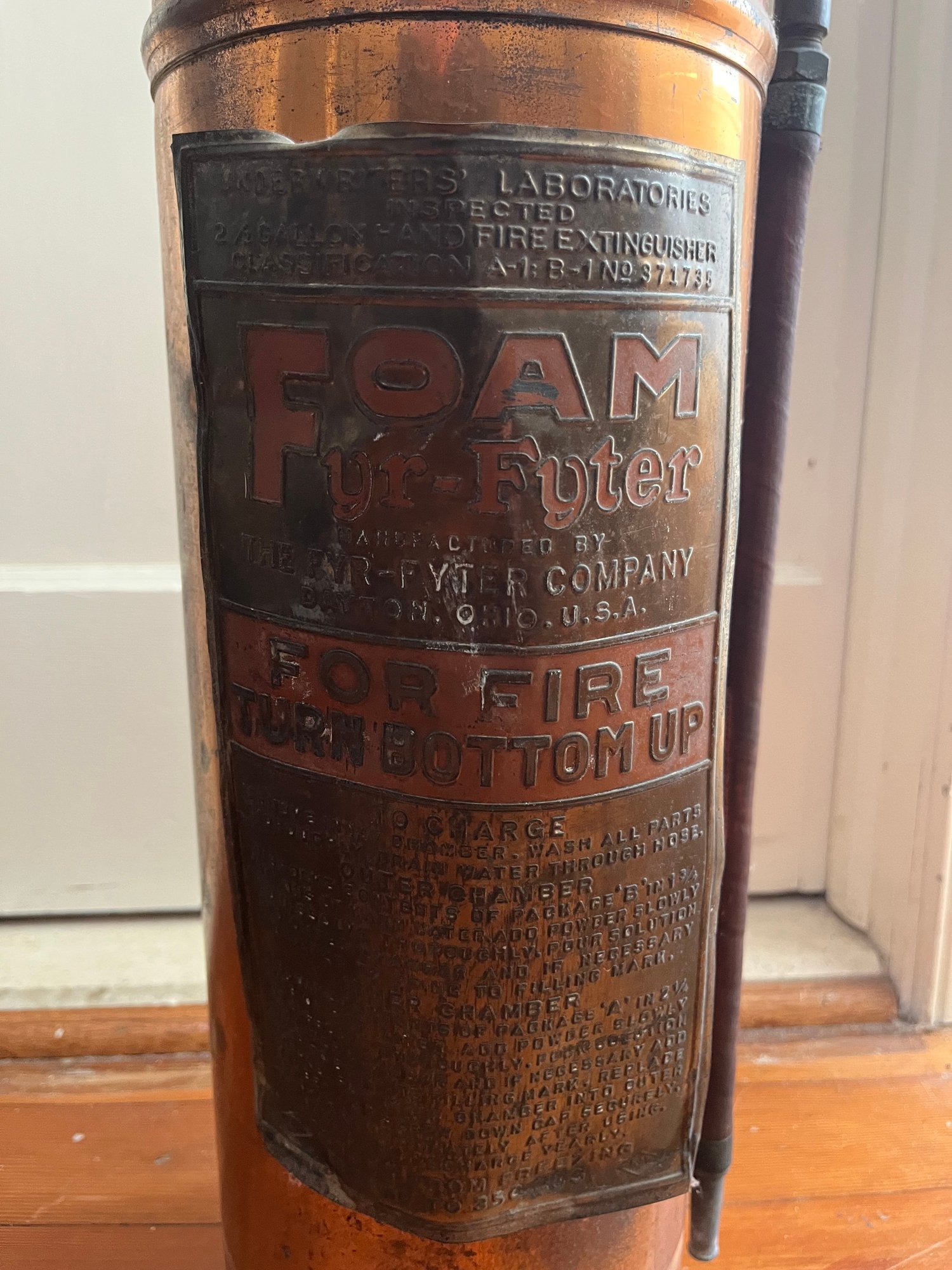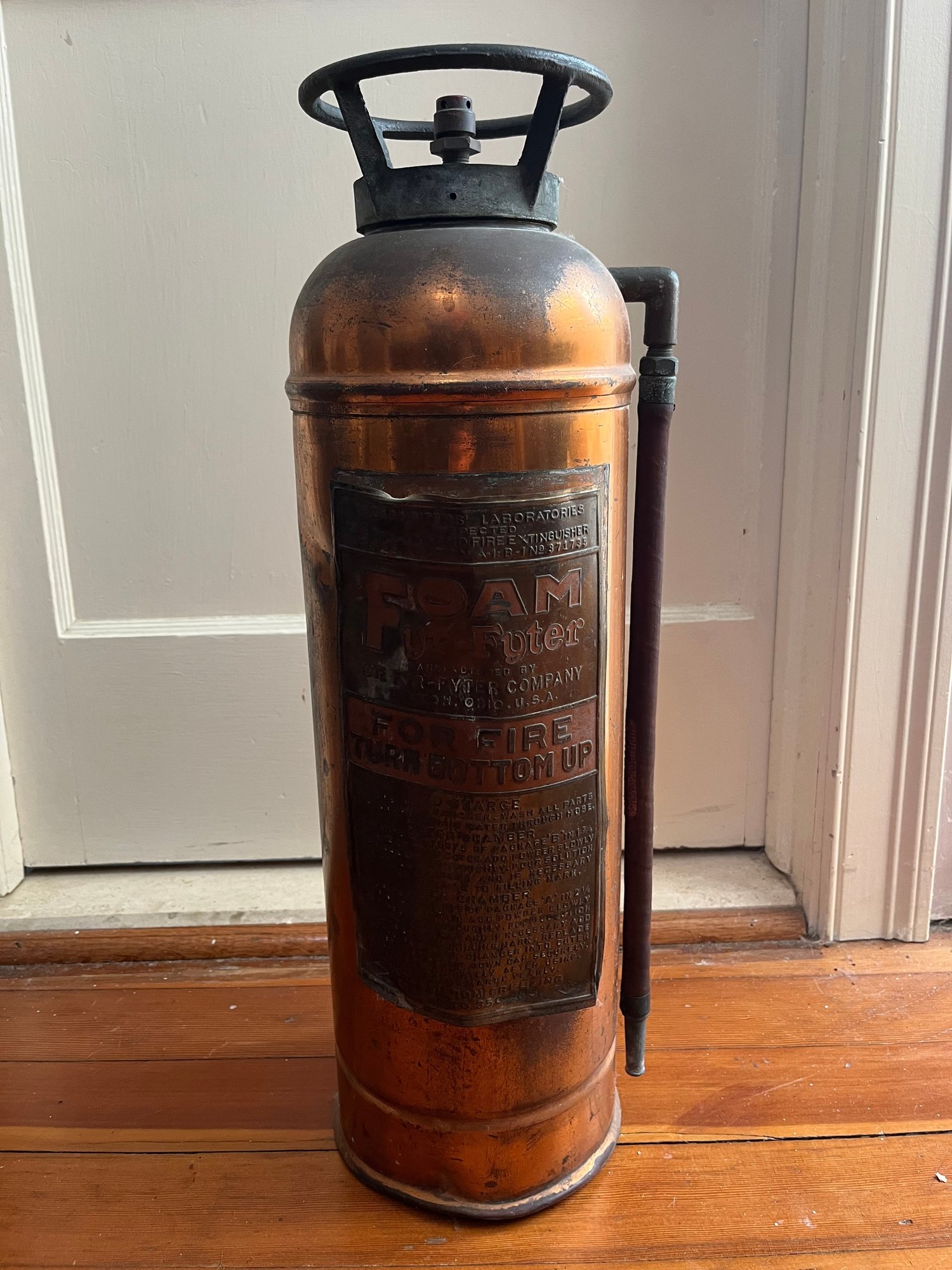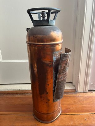Vintage copper and brass fire extinguisher. These items are typically sold as collectible or decorative pieces and are usually empty.