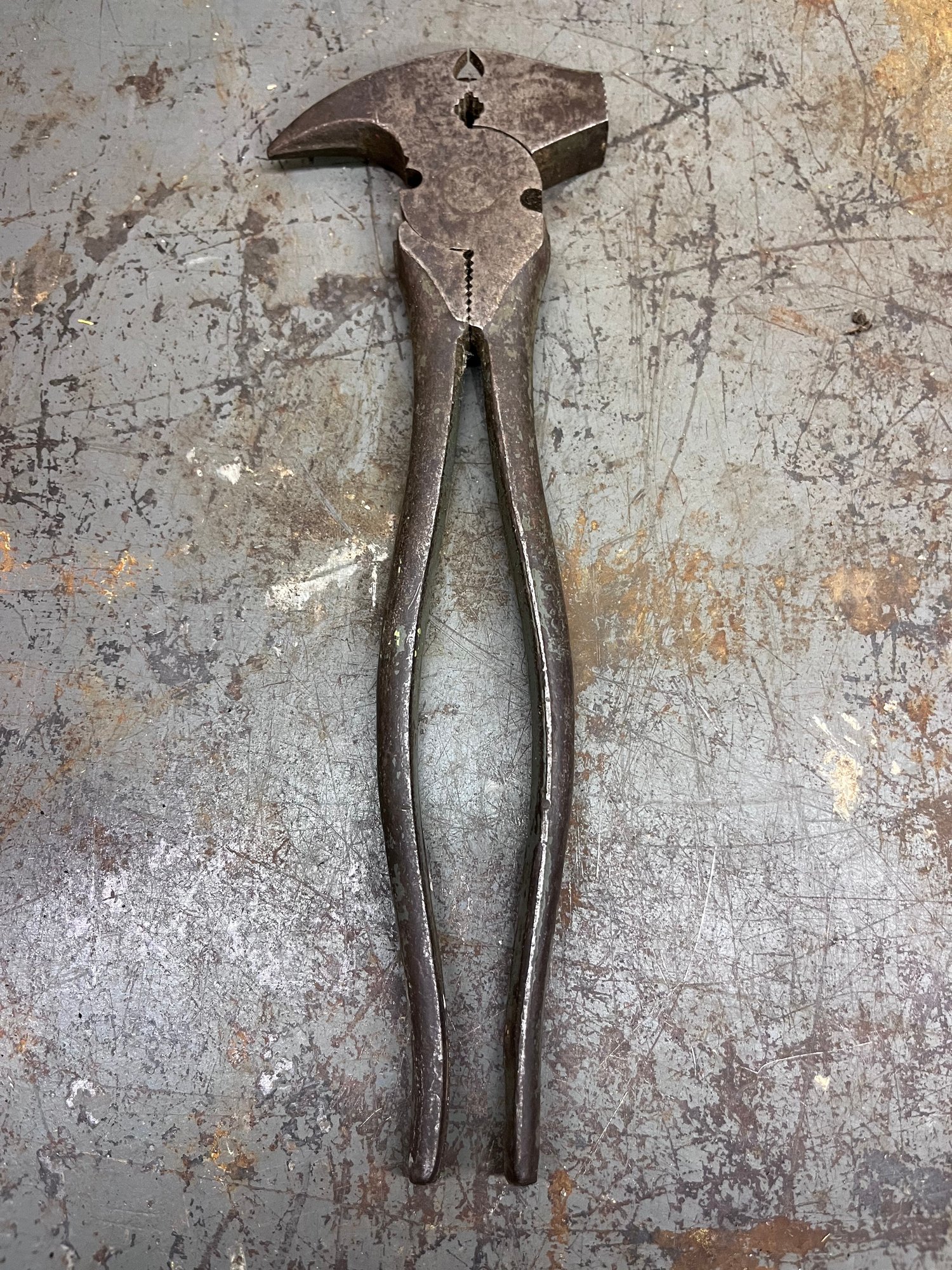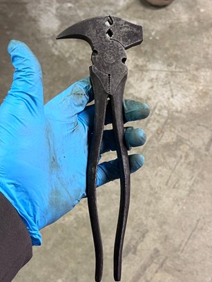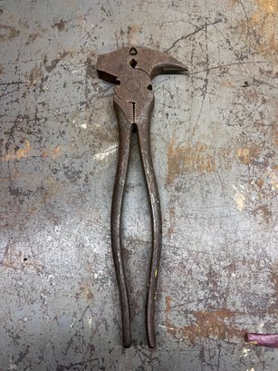 Vintage Craftsman No. 45225 multi-purpose hand tool made in USA. Forged steel combination tool featuring hammer head, claw/nail puller, gripping jaws, and cutting/crimping style plier action. A rugged old-school utility tool designed for farm, fencing, carpentry, or general repair work.