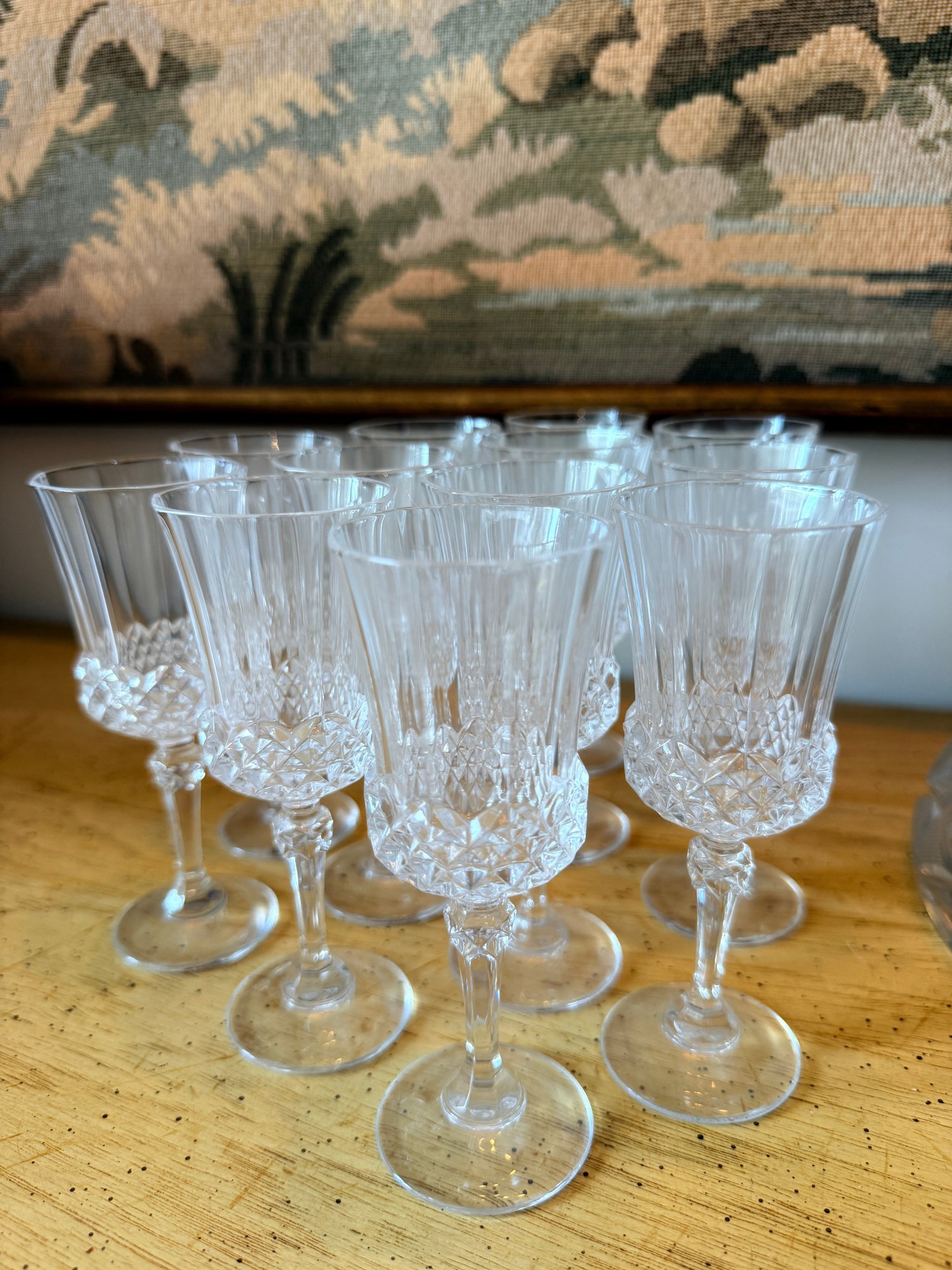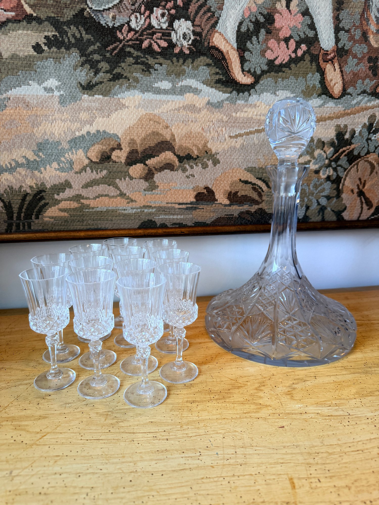 Decanter is 8 inches wide and 12 inches tall. Glasses are 4 1/2 inches tall..
