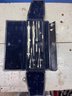 Items Included: The velvet-lined leather case contains various precision drawing instruments, including compasses, dividers, and ruling pens typically used by engineers and architects.