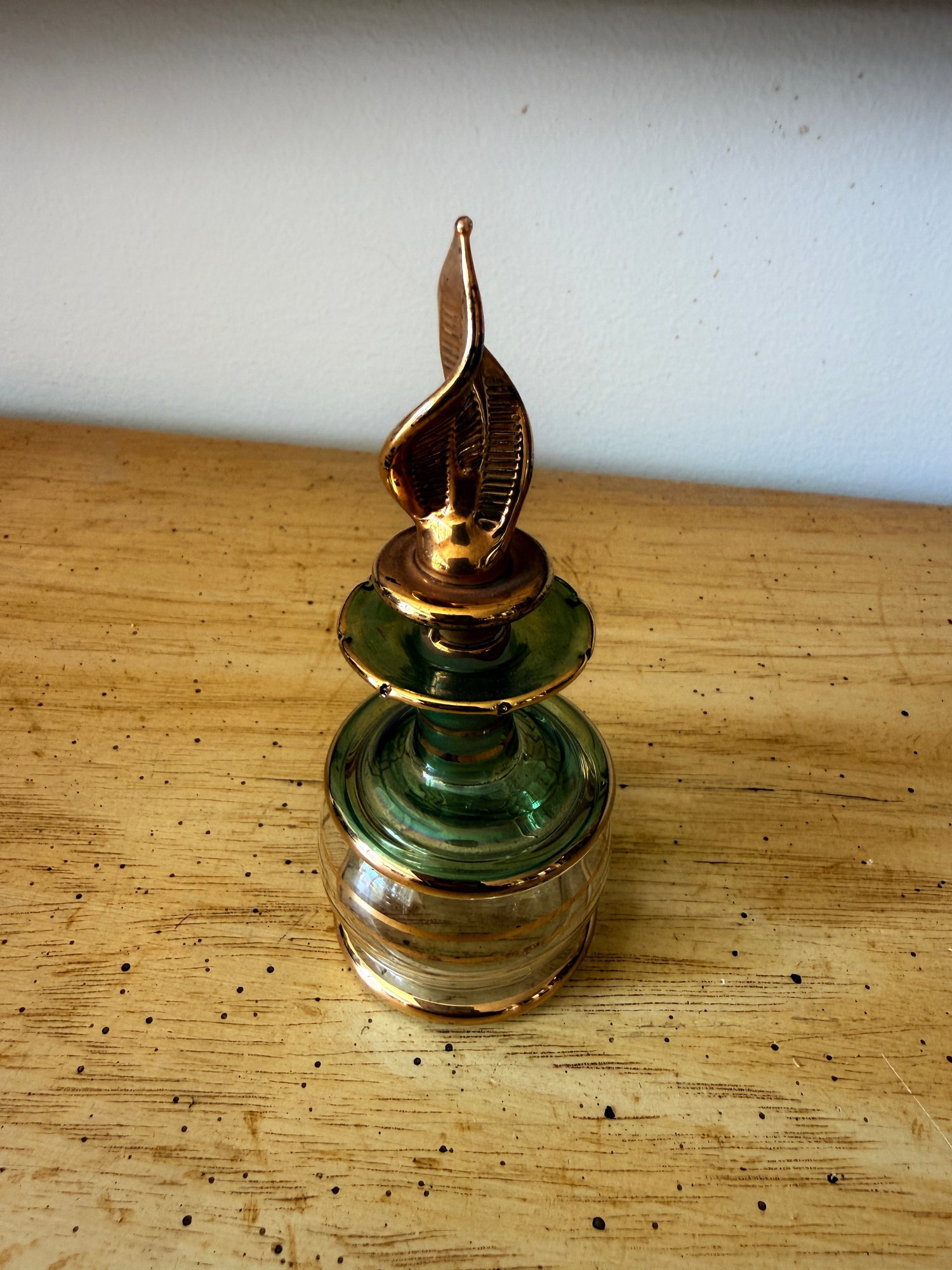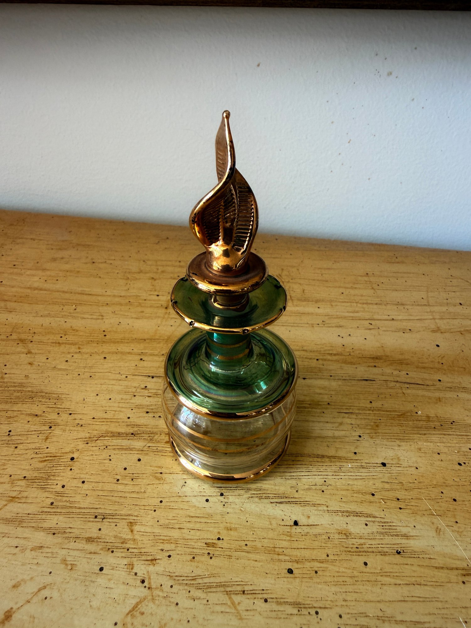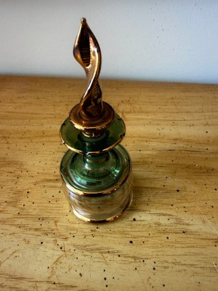 Vintage Egyptian hand-blown glass perfume bottle, likely featuring gold accents and a distinctive stopper. Such decorative bottles are handcrafted using traditional Egyptian glassmaking techniques