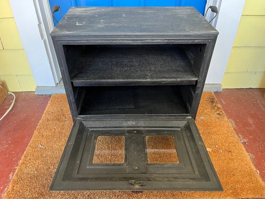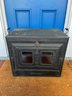 The unit features a black metal body with a glass front door and wire handles on the sides.