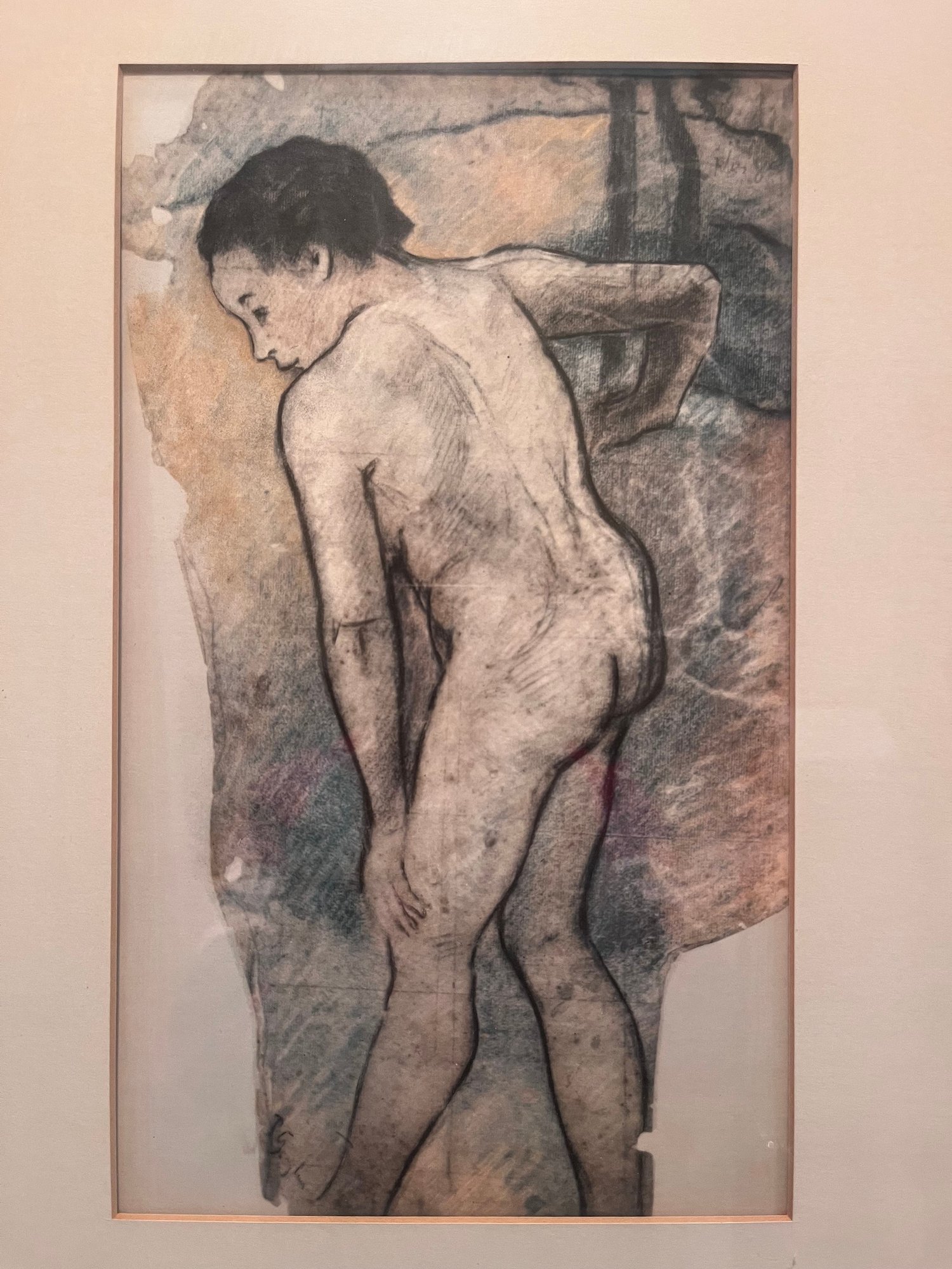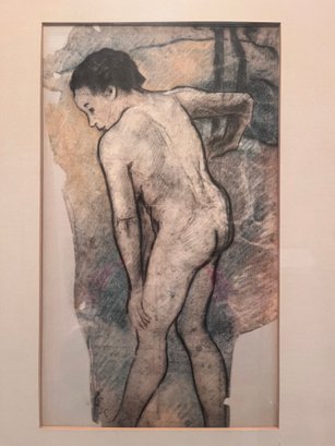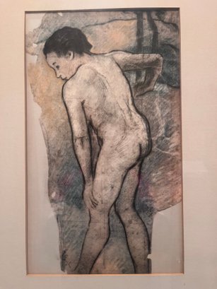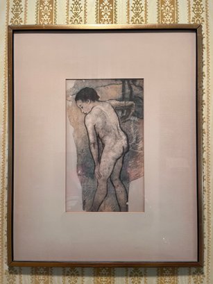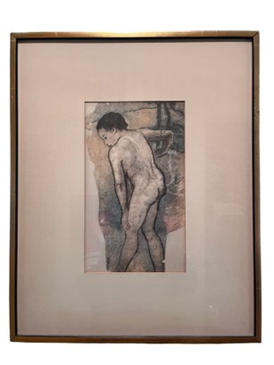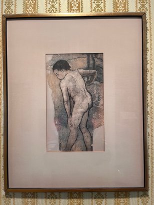 Elegant vintage framed artwork depicting a standing female nude figure in a contemplative pose. Rendered in an etching / lithograph style with soft muted tones and expressive linework. Professionally matted in a wide neutral mat with slim metallic frame, giving it a clean mid-century modern presentation.