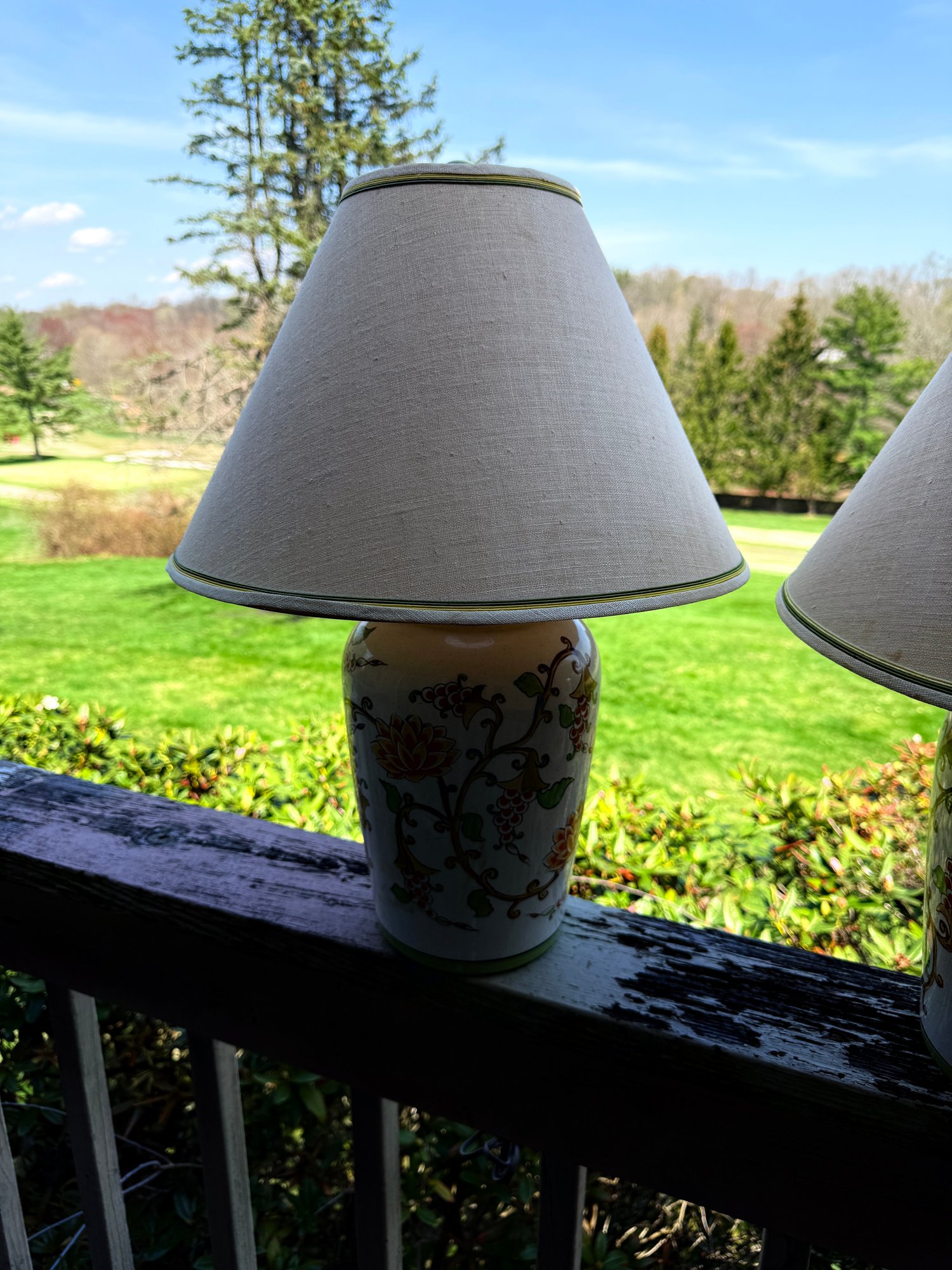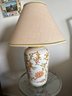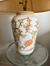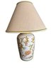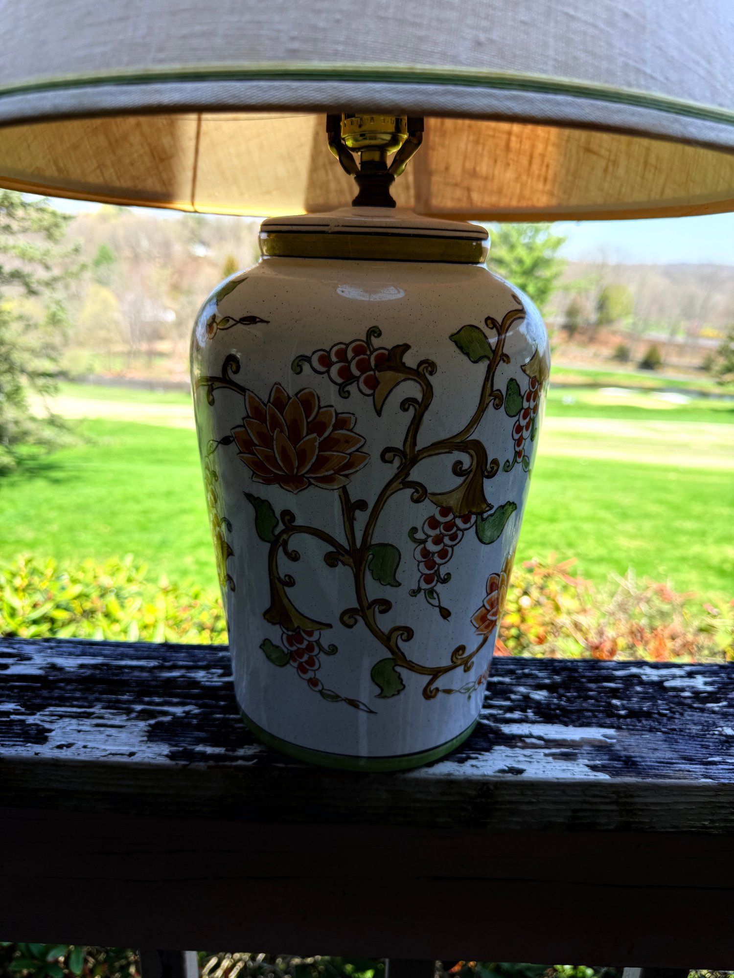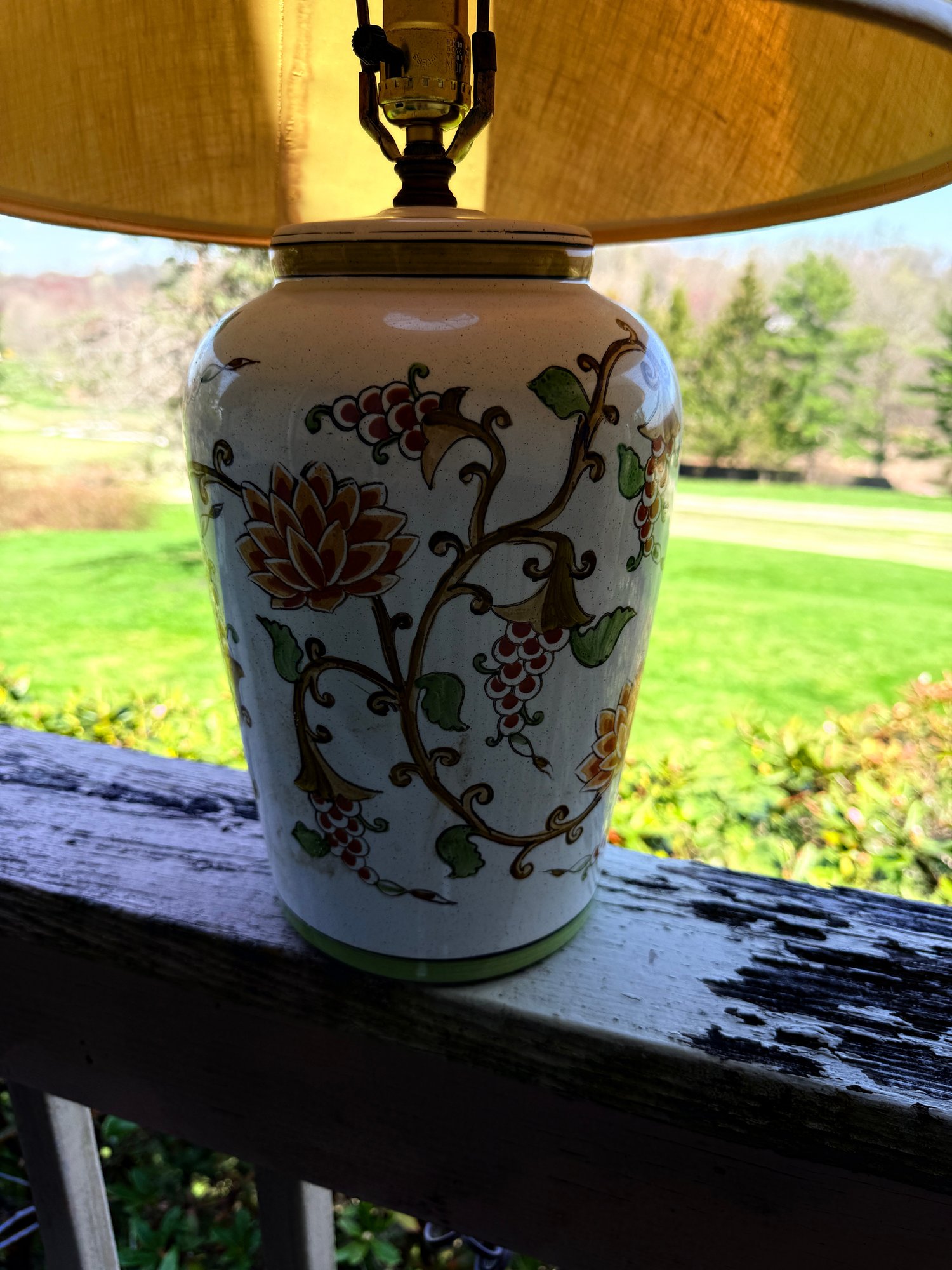Vintage, hand-painted ceramic lamp featuring a cream base with orange, green, and brown floral and vine patterns.