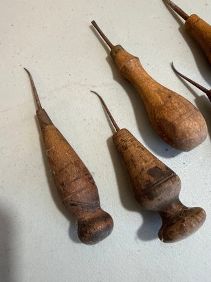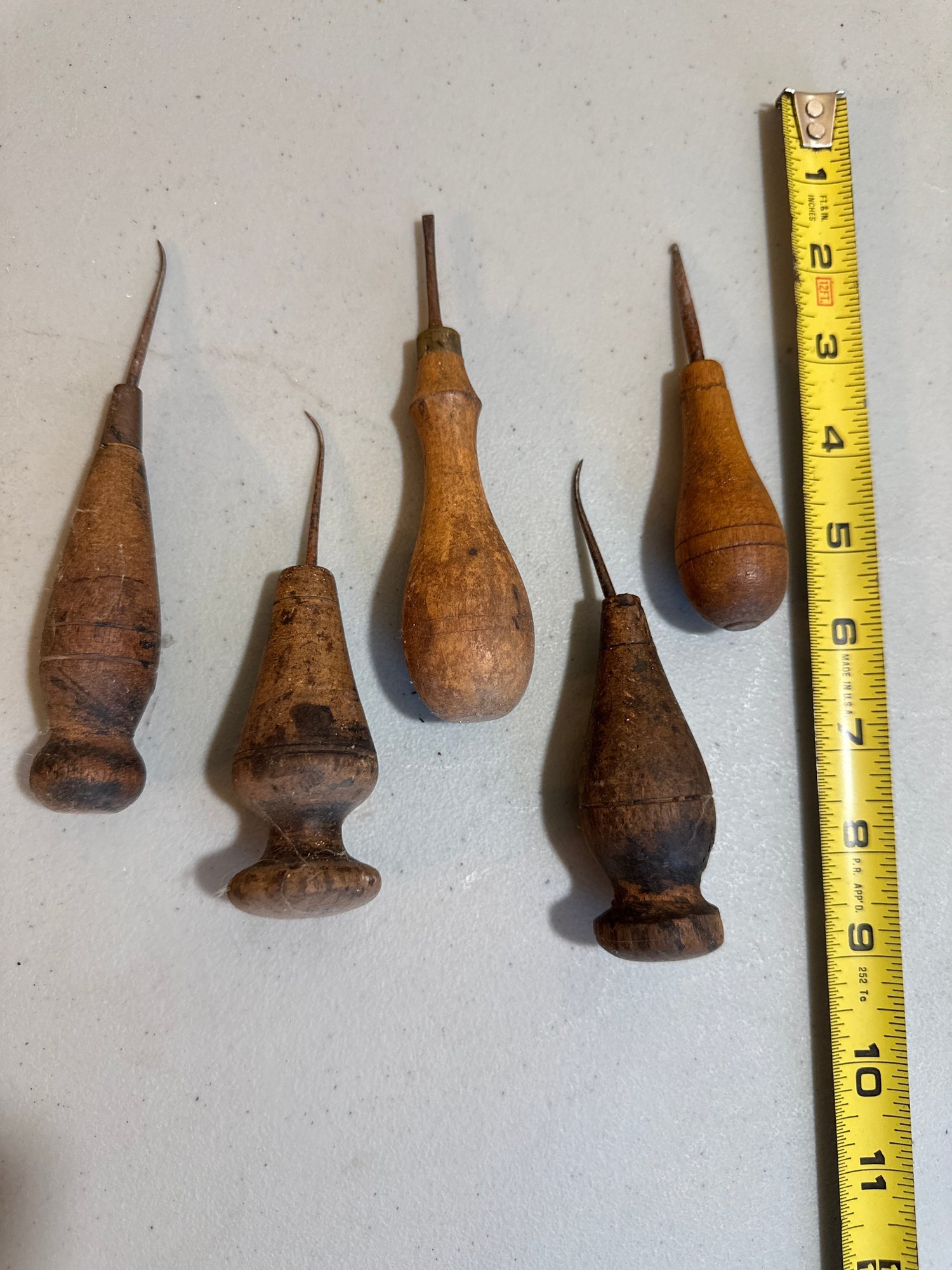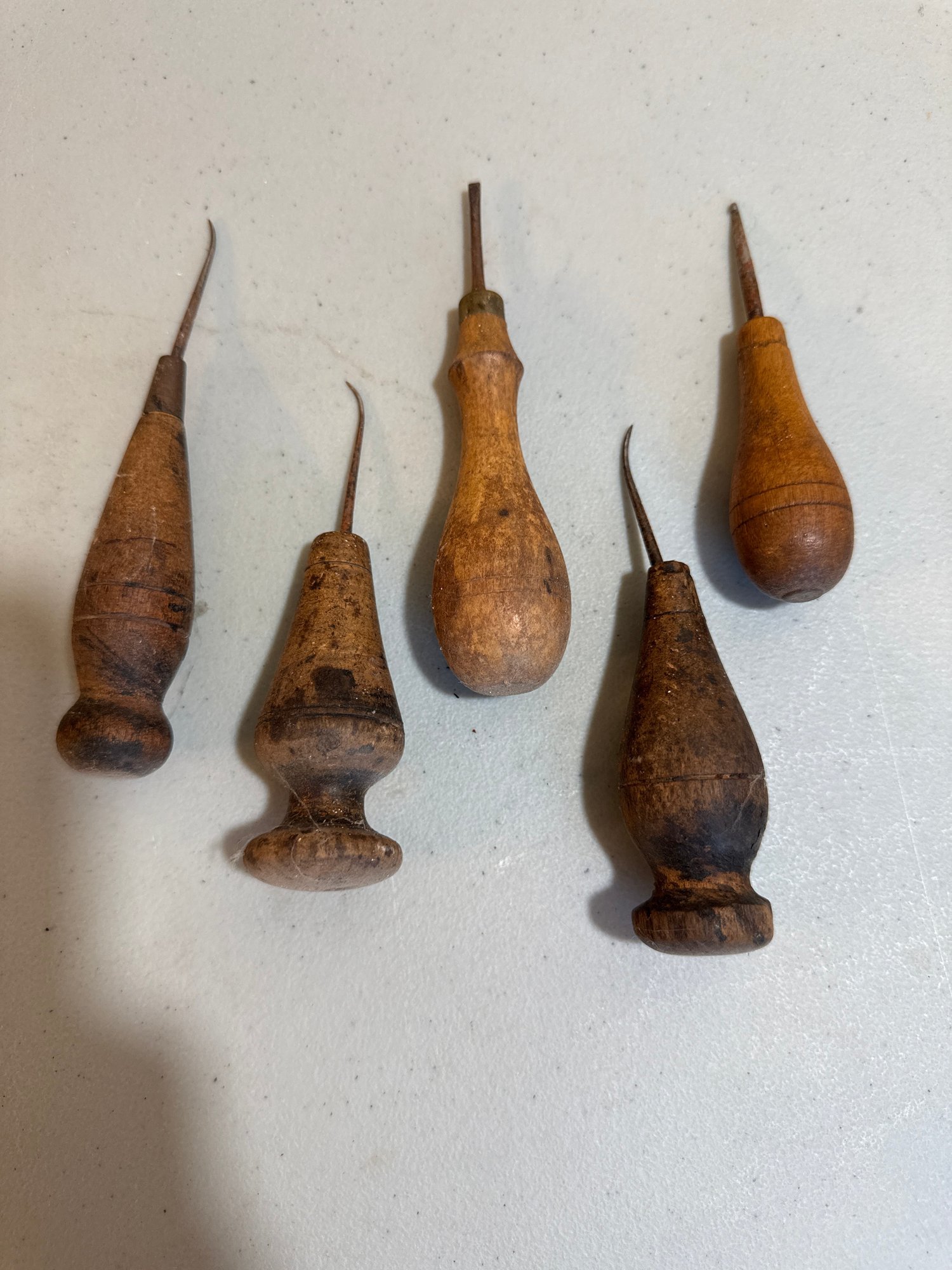 The tools feature sharp, tapered metal shafts—either straight or slightly curved—set into small wooden handles. These types of tools date back to early 19th-century leather crafting and are highly collectible.