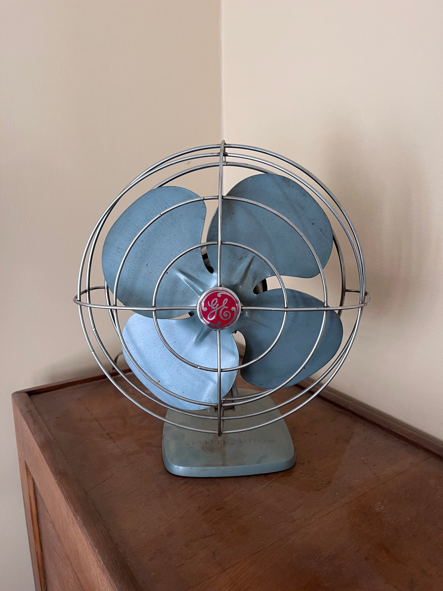 Vintage General Electric (GE) oscillating metal desk fan, likely from the 1950s.