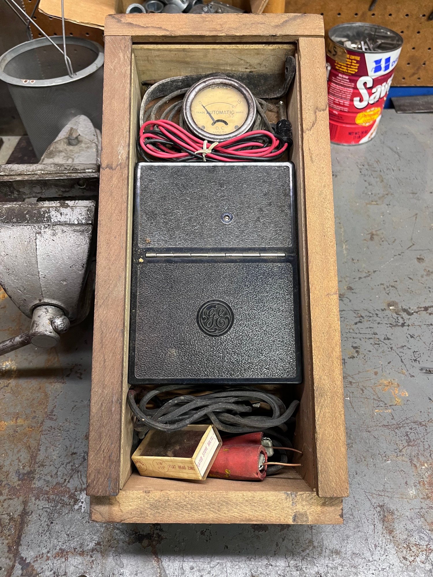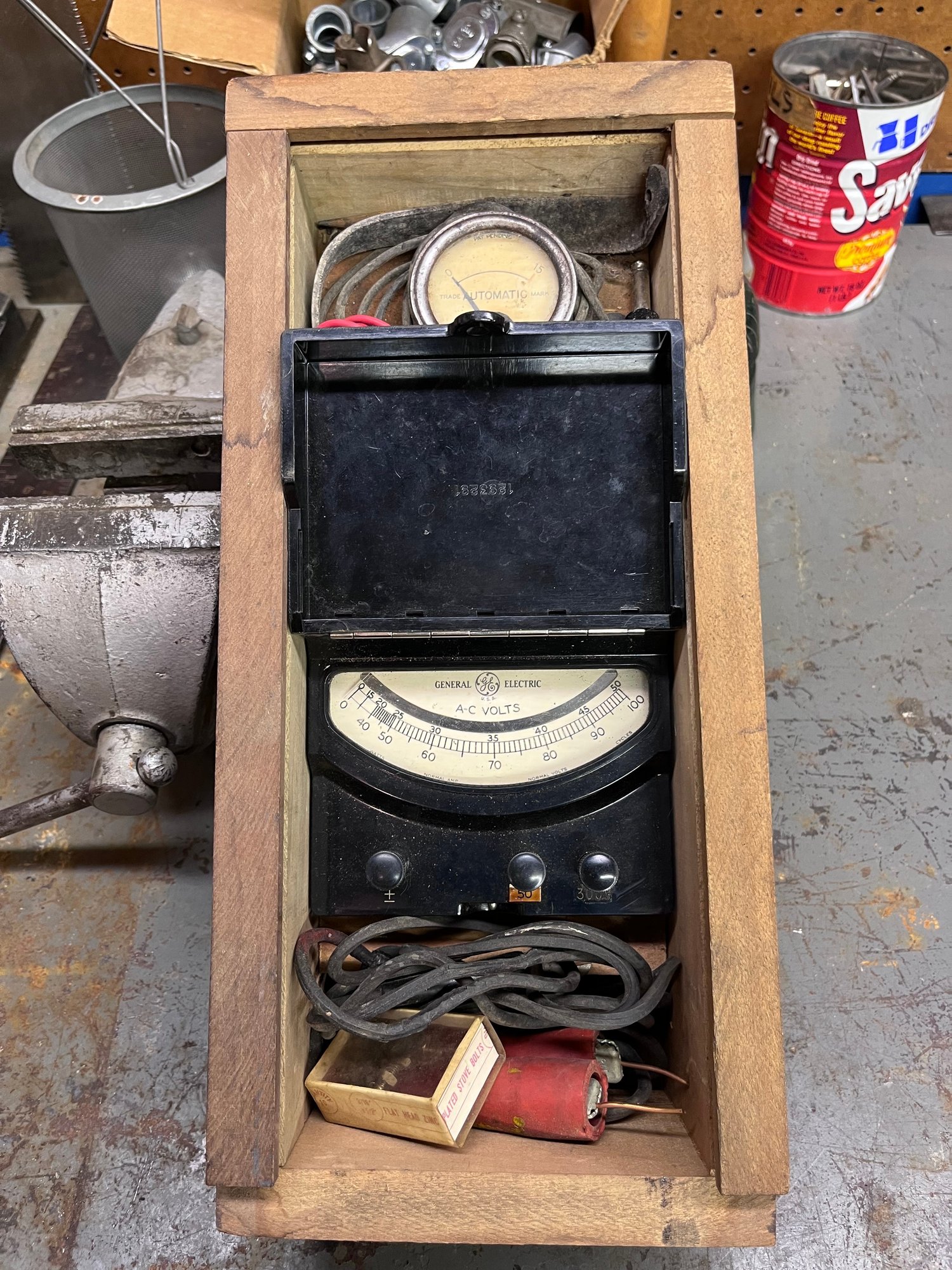 General Electric DC voltmeter housed in a wooden carrying case, typically used for testing electrical circuits in the early 20th century.