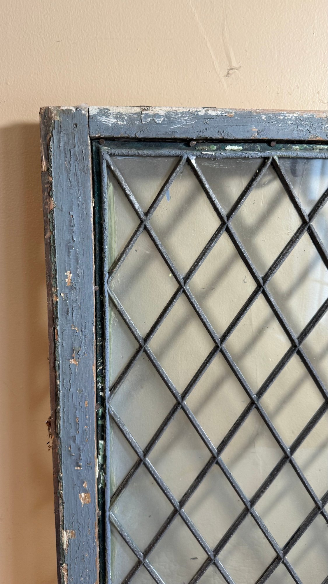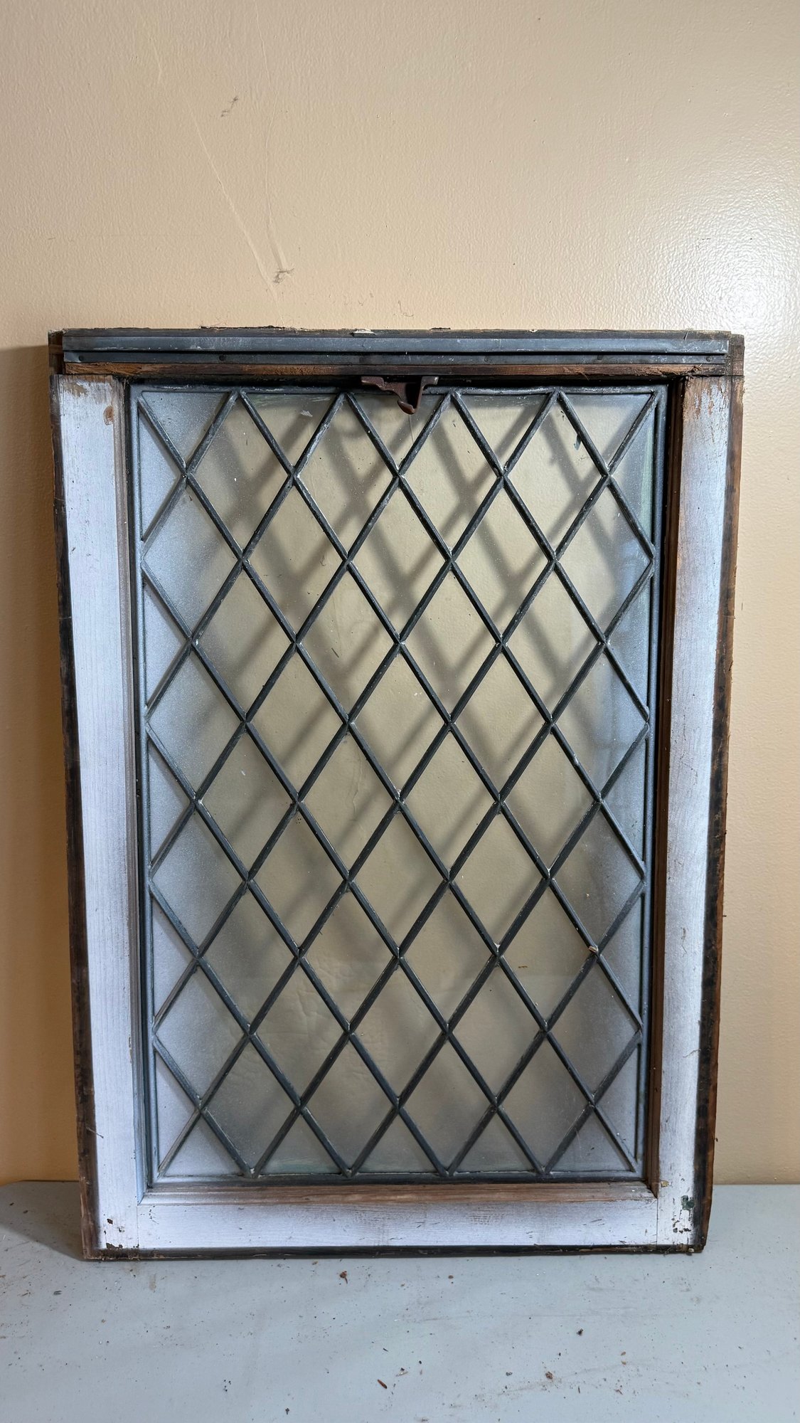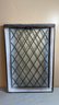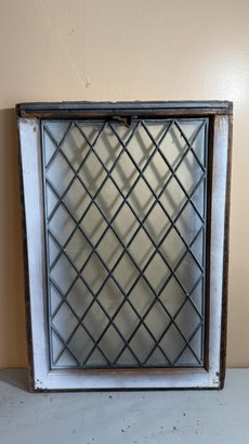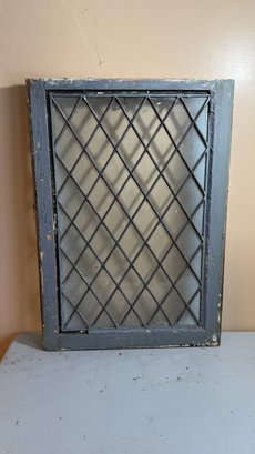 Vintage glass window featuring a diamond-shaped pane pattern, often utilized in architectural salvage or industrial design projects. The window includes a worn, weathered wooden frame. Commonly used in historical restorations, cabinet door inserts, or as decorative wall art.