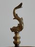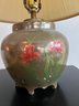 Beautiful vintage table lamp featuring a gold-toned crackle glass / textured ginger jar style body with hand-painted red floral and green leaf motif. The lamp sits on decorative scalloped feet and is topped with an ornate brass-tone koi fish finial, giving it an elegant Asian-inspired look. Includes pleated shade shown in photos.
