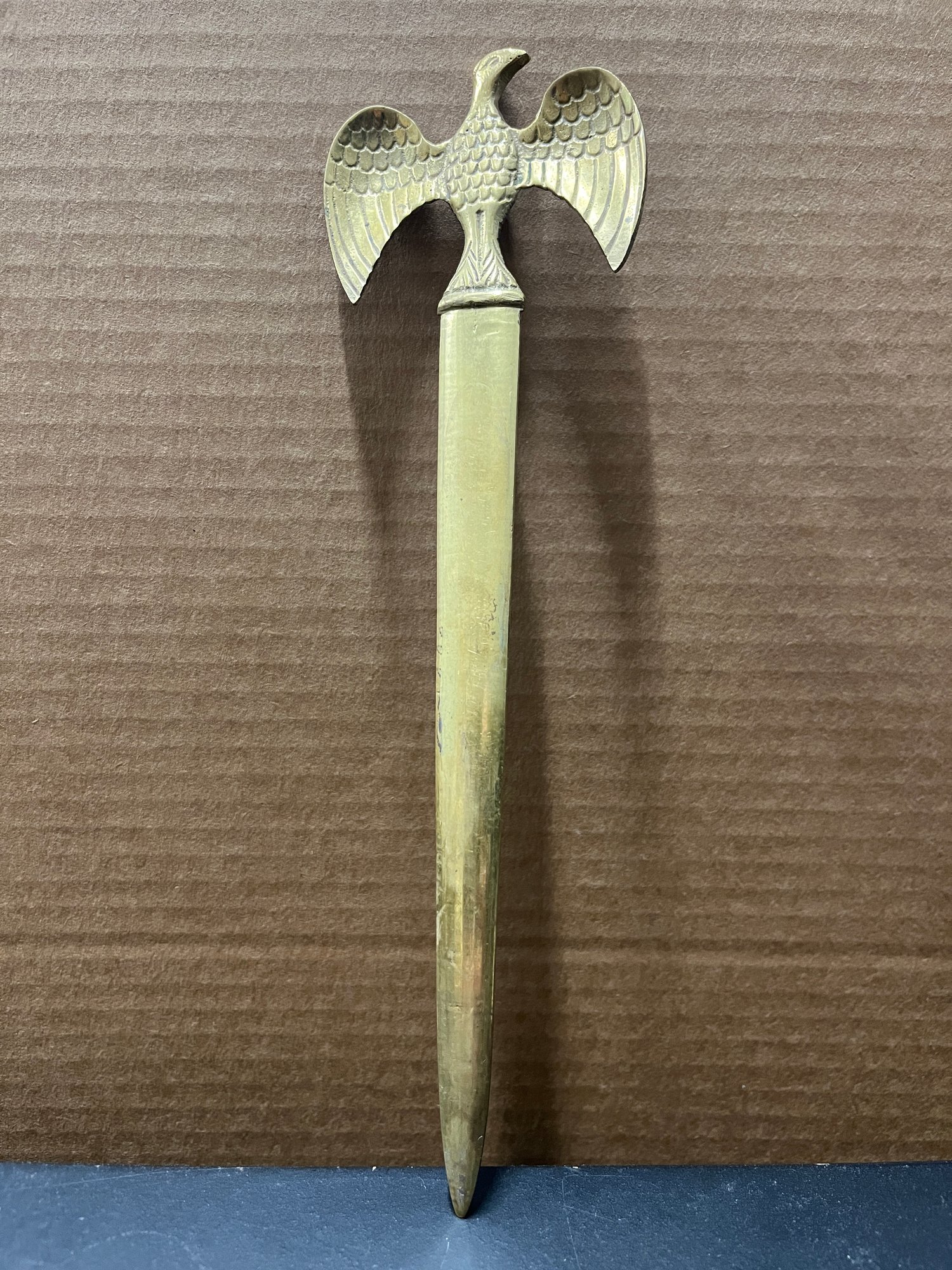 This vintage letter opener features a striking design of a solid brass American Eagle, adding a patriotic touch to your desk. The piece is 10 inches long and made from heavy brass, giving it a durable and substantial feel. It is perfect for opening envelopes with ease and style, making it a functional and decorative addition to any desktop or collection.