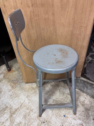 vintage industrial shop stool, typically made of steel and often featuring a distressed, gray painted finish, a round seat, and a sturdy metal backrest.