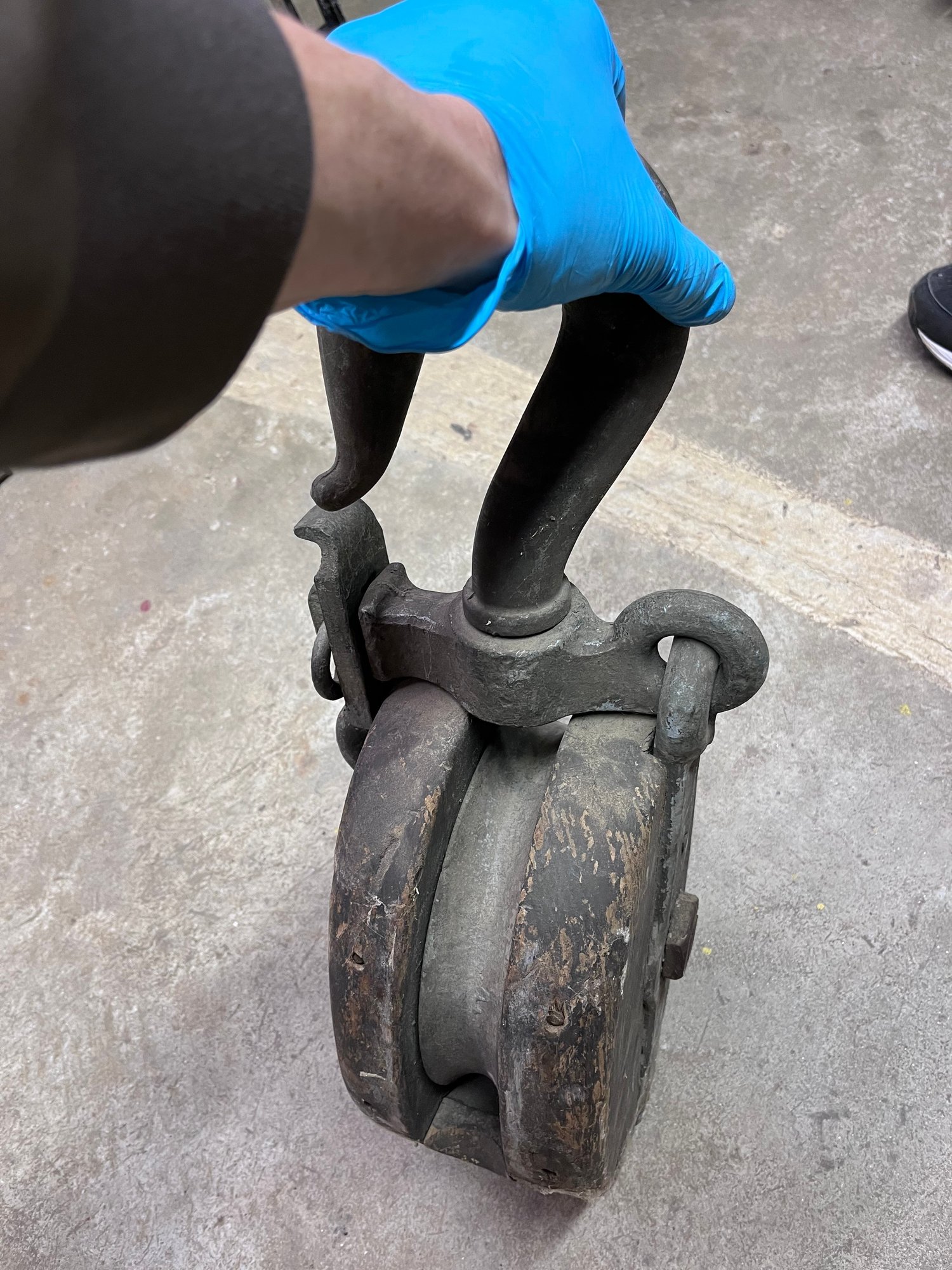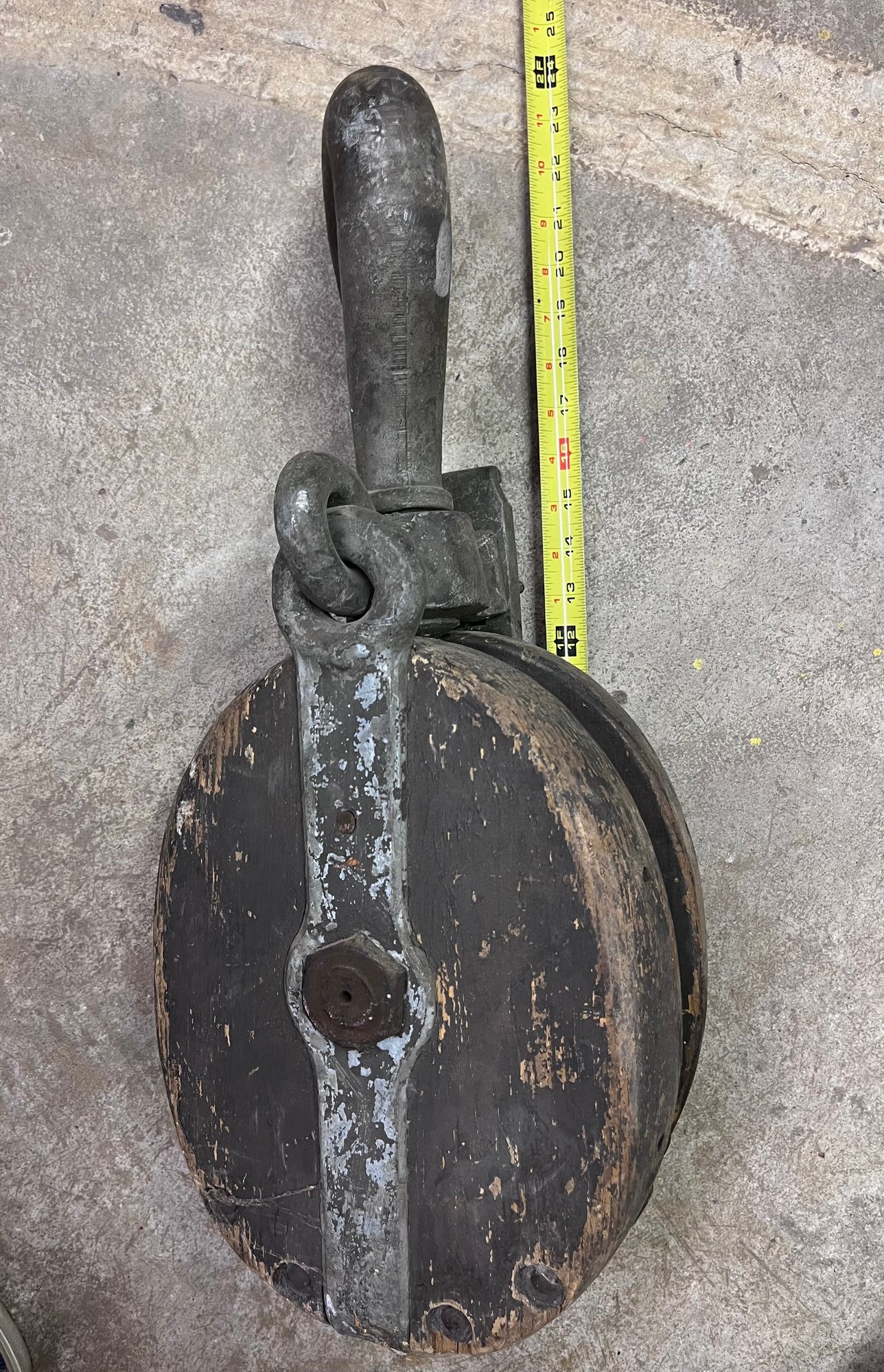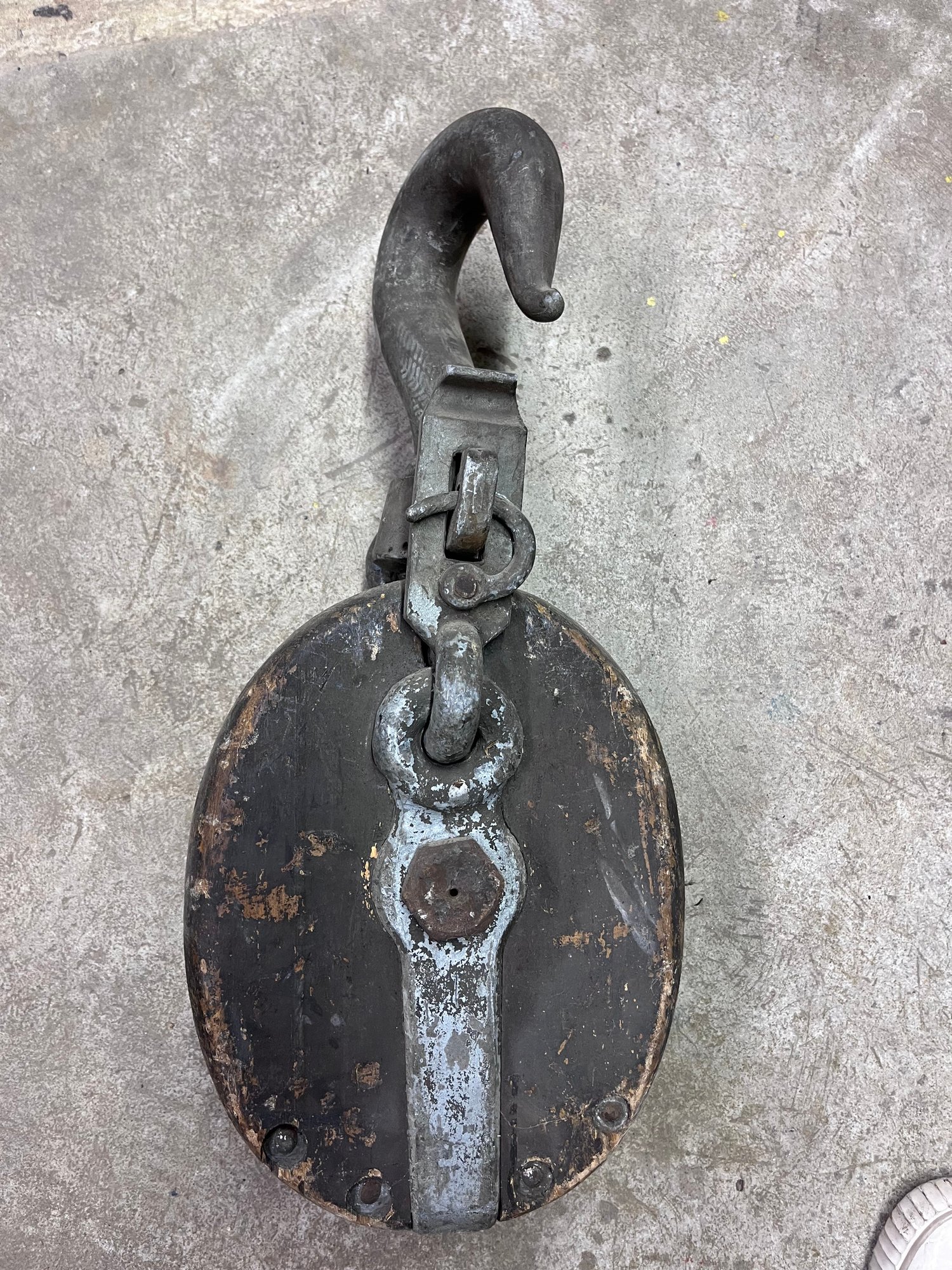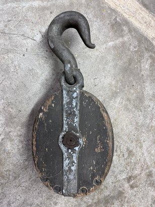 Viintage industrial wooden block pulley, commonly used in nautical or agricultural settings for lifting heavy loads.