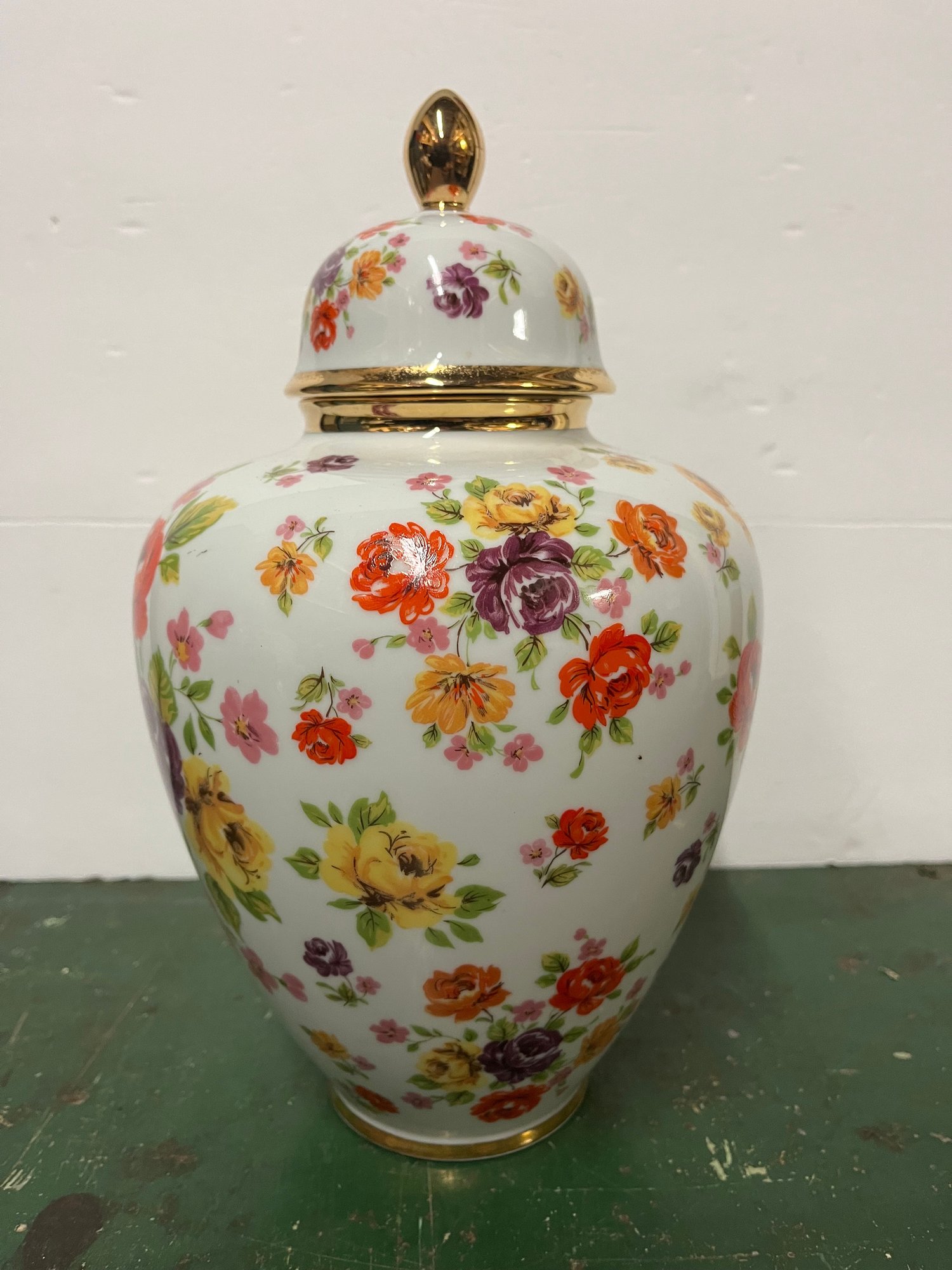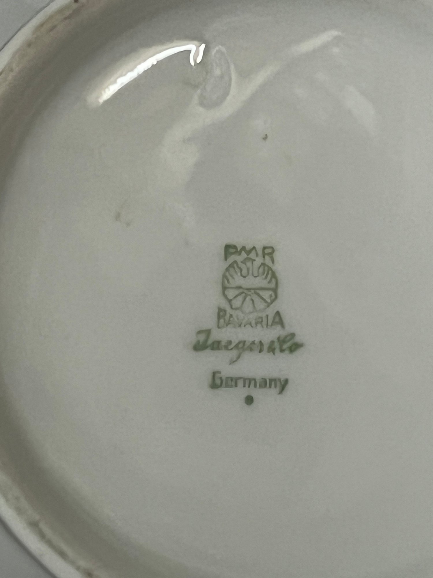 This vintage Jaeger & Co. vase is a beautiful piece with a flower pattern featuring gold accents, and an asymmetrical shape. Crafted from porcelain in Bavaria, Germany between 1949-1979, this medium-sized vase stands at 11 inches tall and 6 inches wide. Its glossy finish and original production technique make it a unique and stylish addition to any collection of decorative collectibles. Perfect for all occasions, this vase is a timeless piece that exudes elegance and charm.