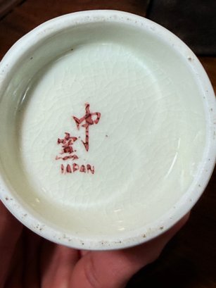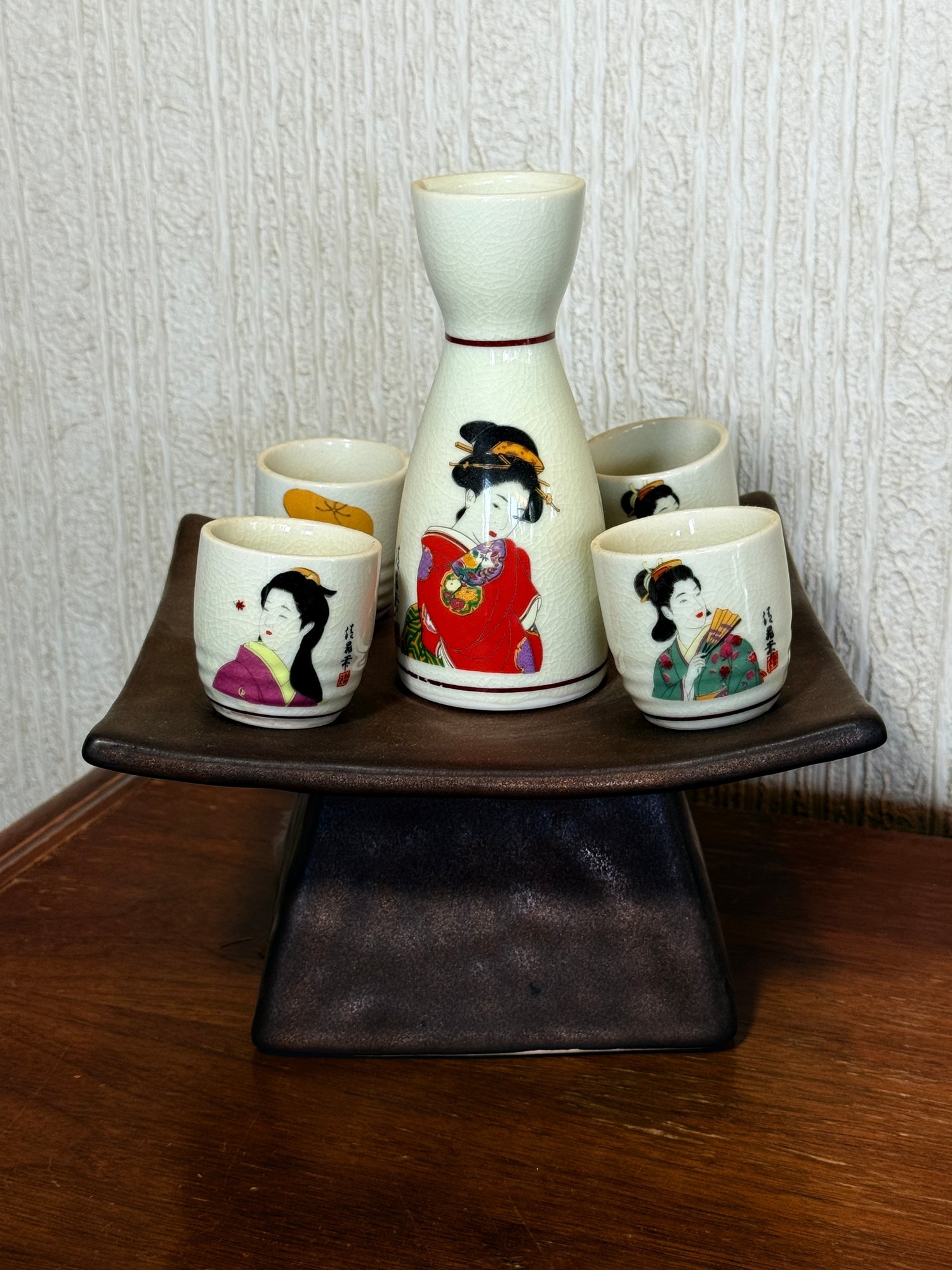 Each piece is adorned with hand-painted portraits of Japanese women in traditional kimonos. Made of ceramic or porcelain featuring a cream-colored glaze and kan-nyu (crazing) typical of vintage Japanese ceramics.