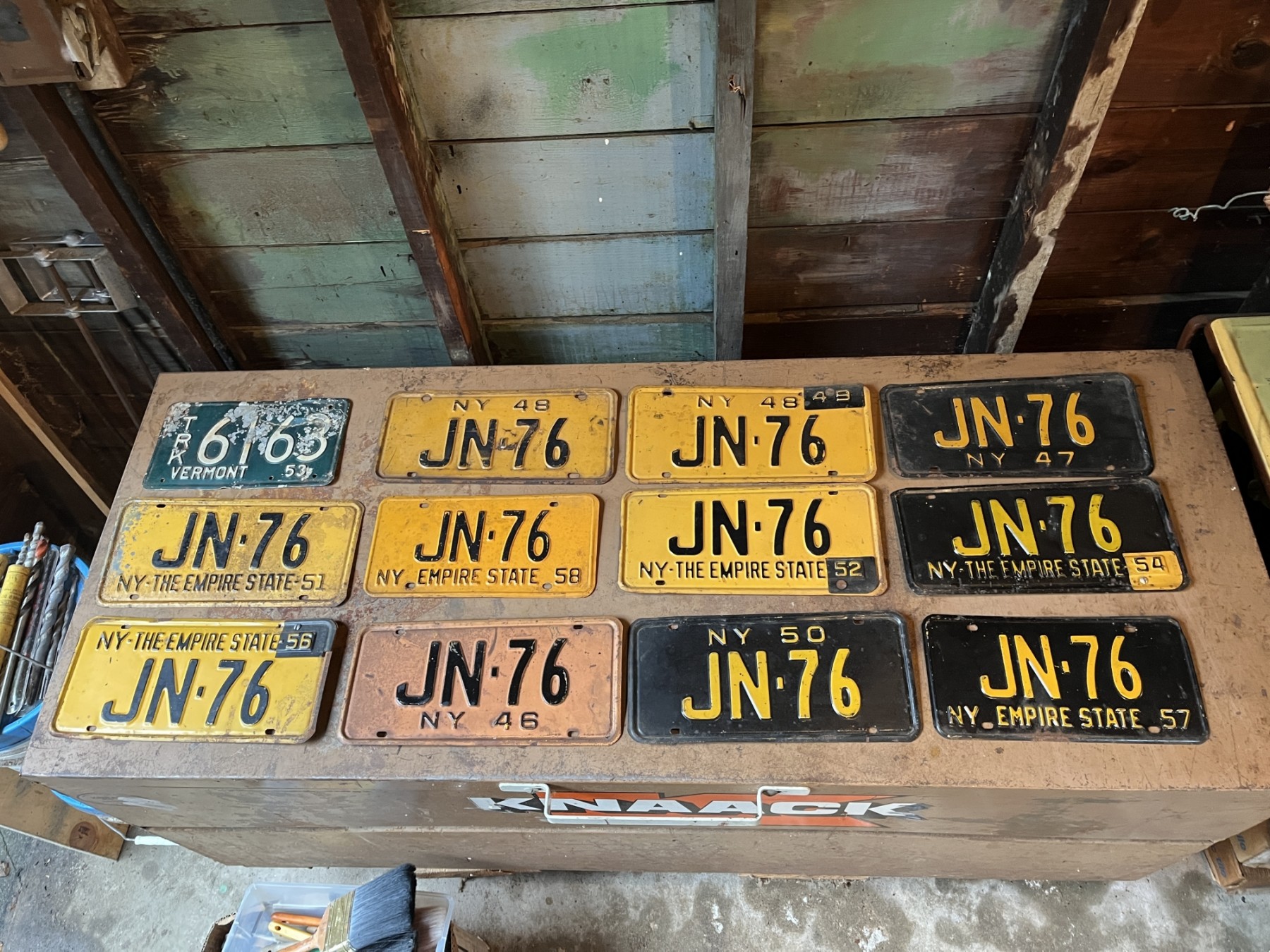 12 vintage license plates ranging from 1946 through 1958. 11 New York and 1 Vermont.