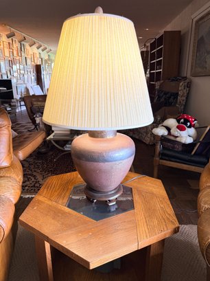 Lamp features a unique, handcrafted aesthetic with a flared, empire-style pleated lampshade and a textured ceramic base. The base has a multi-toned, earthy finish, transitioning from a darker grey or brown at the top to a warm terra cotta or dusky pink at the bottom.