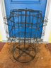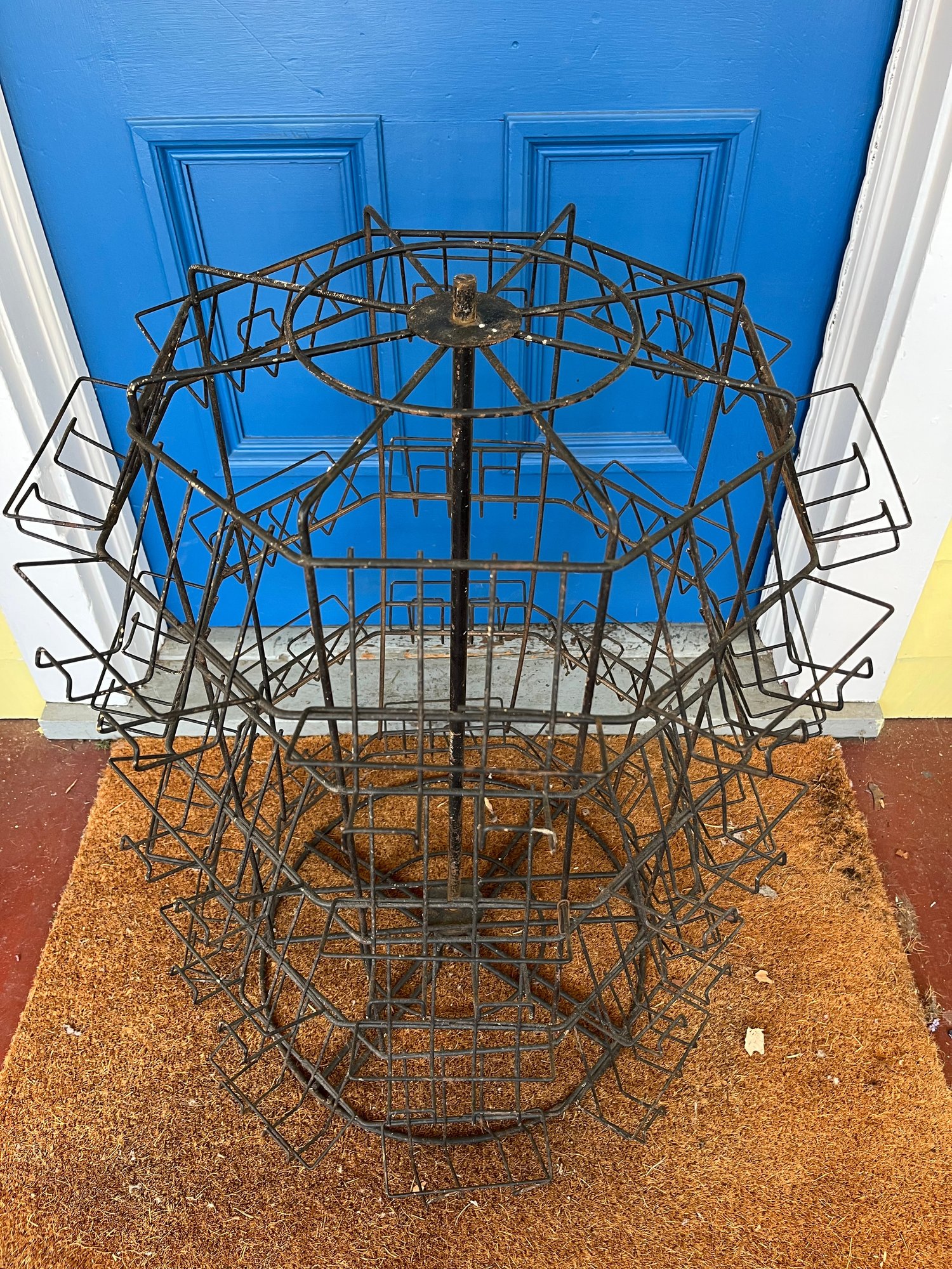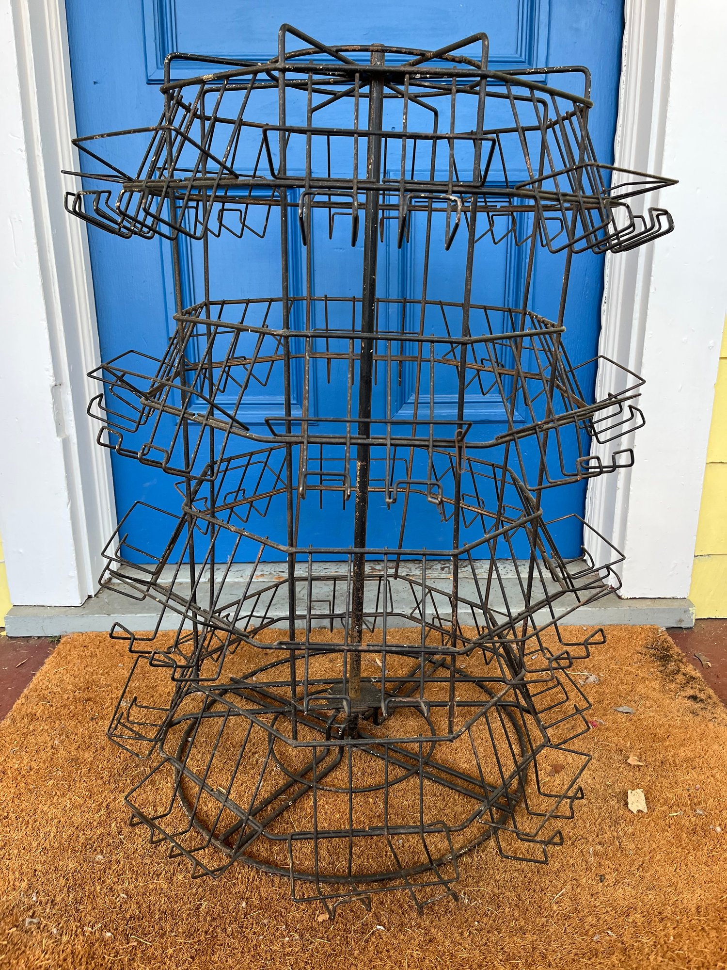 Vintage metal spinning rack is a retail display stand commonly used for greeting cards, postcards, or brochures. It features multiple tiers of wire pockets that rotate 360 degrees for easy browsing. These racks are often found in bookstores, gift shops, and thrift stores