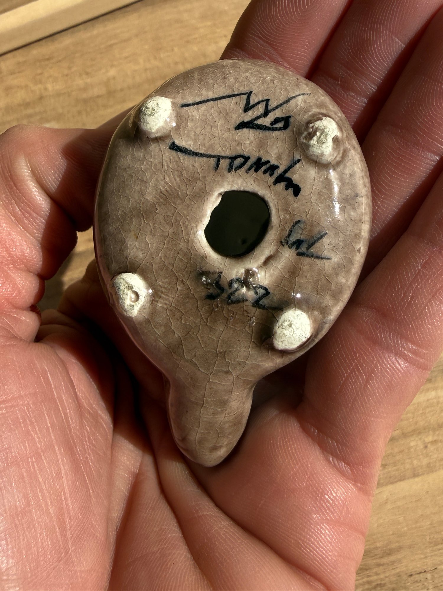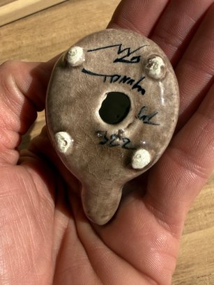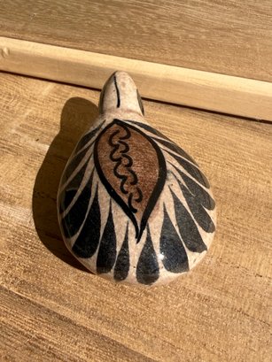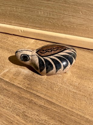 Vintage Mexican folk art pottery turtle figurine, specifically in the style of Tonalá pottery.