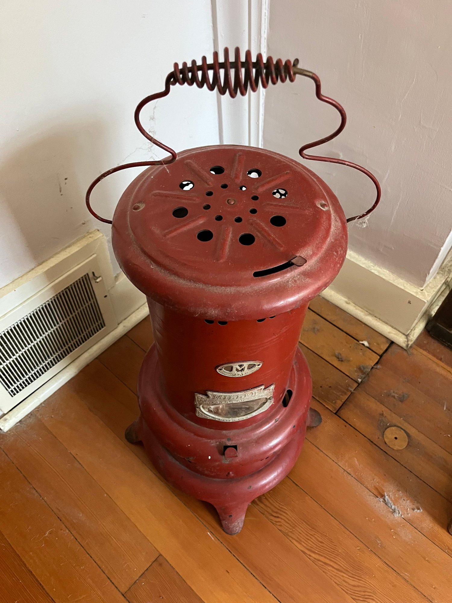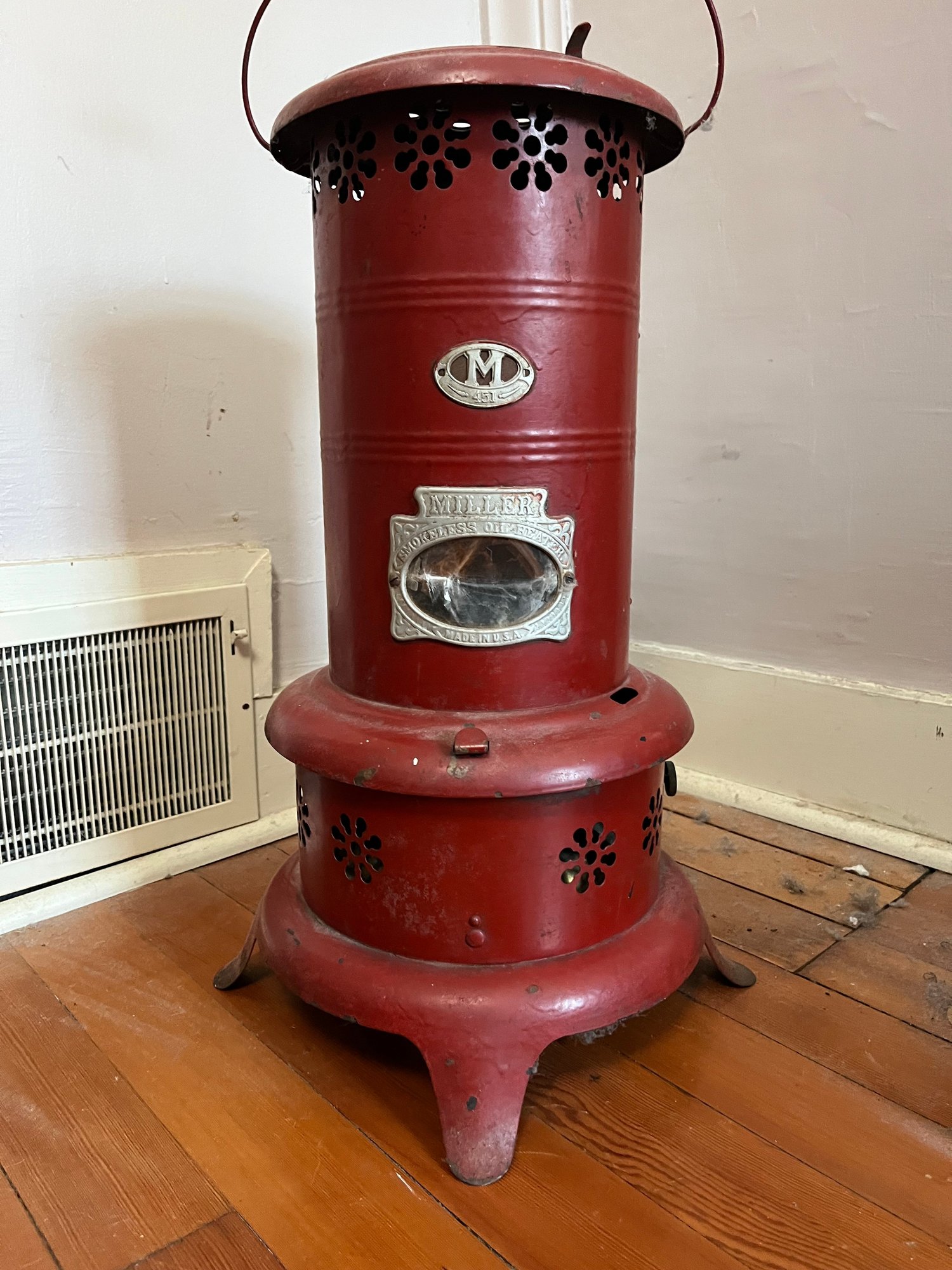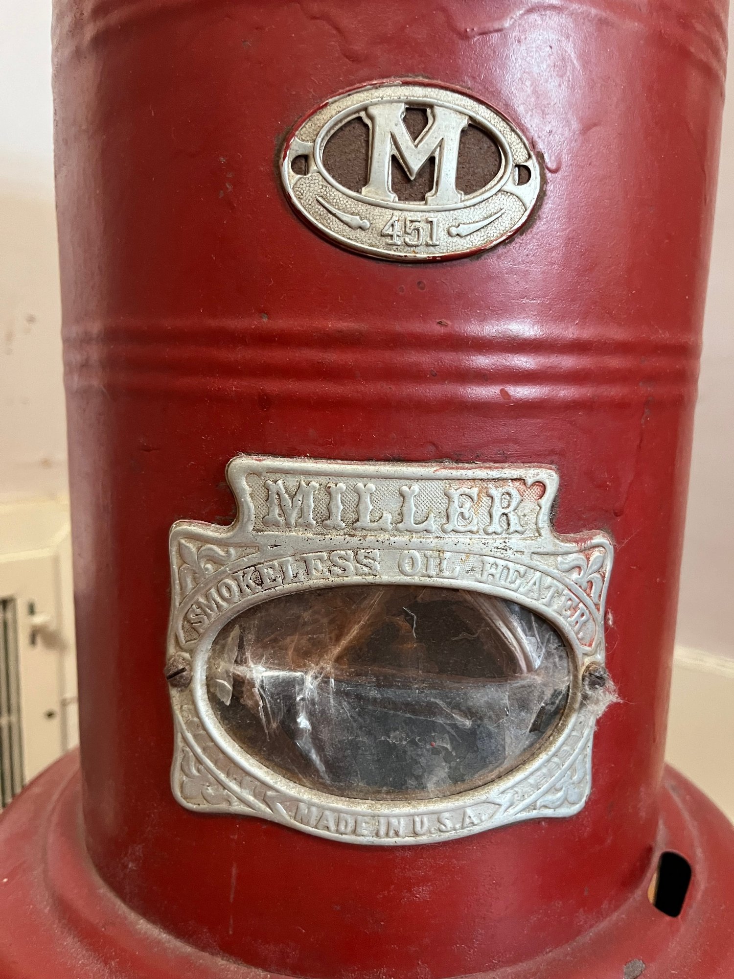 Vintage Miller 451 kerosene/oil heater, likely from the mid-20th century.